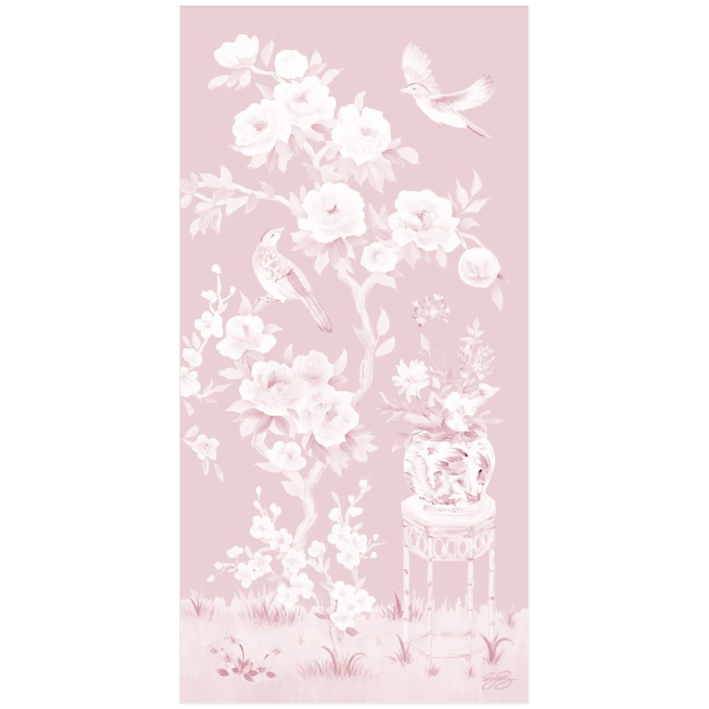 A Symphony of Nature: Two birds gather in a gracefully arching peony tree, their feathers mirroring the soft shapes of leaves and petals. Nearby, a chinoiserie planter rests atop a bamboo stand.