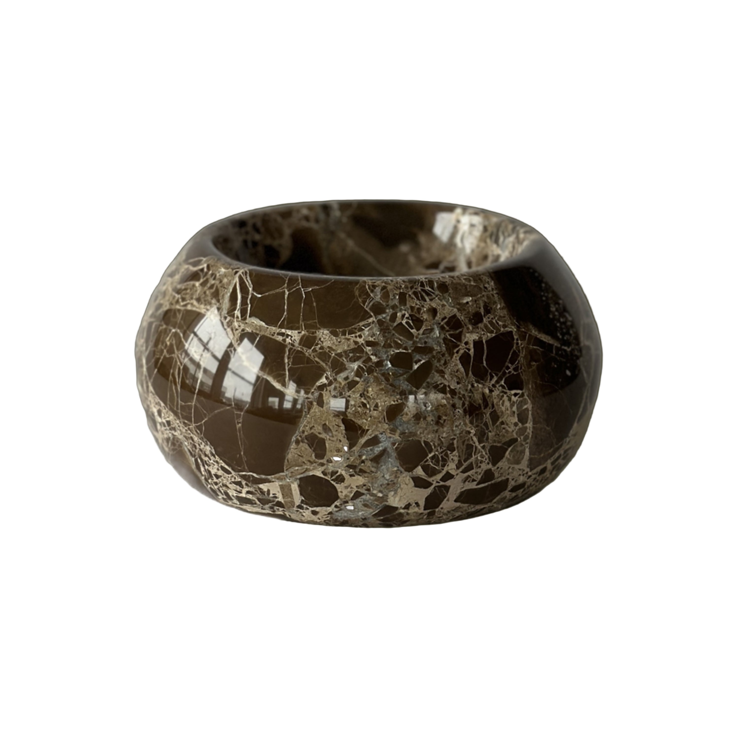 Carved from a single block of stone, its smooth surfaces and deep basin make it versatile for holding jewelry, keys, or a handful of olives at the table. Substantial in hand yet small enough to live on a desk or nightstand, it balances function with sculptural presence.