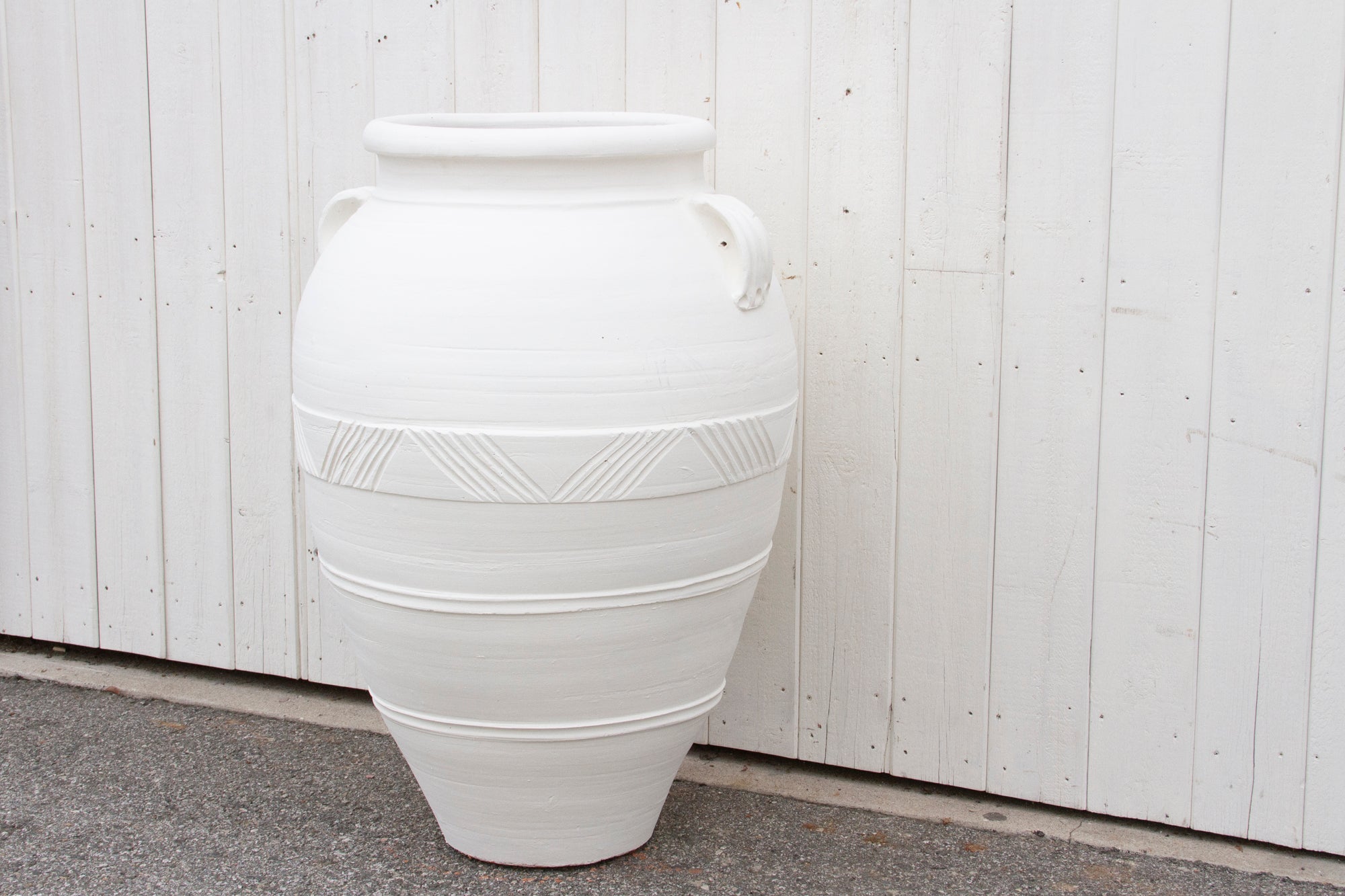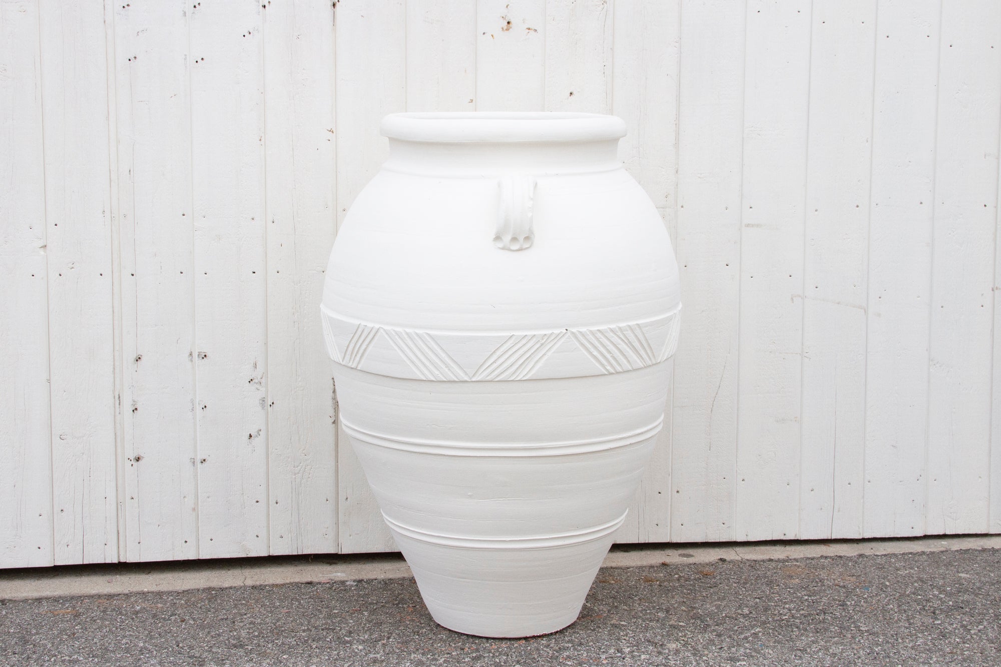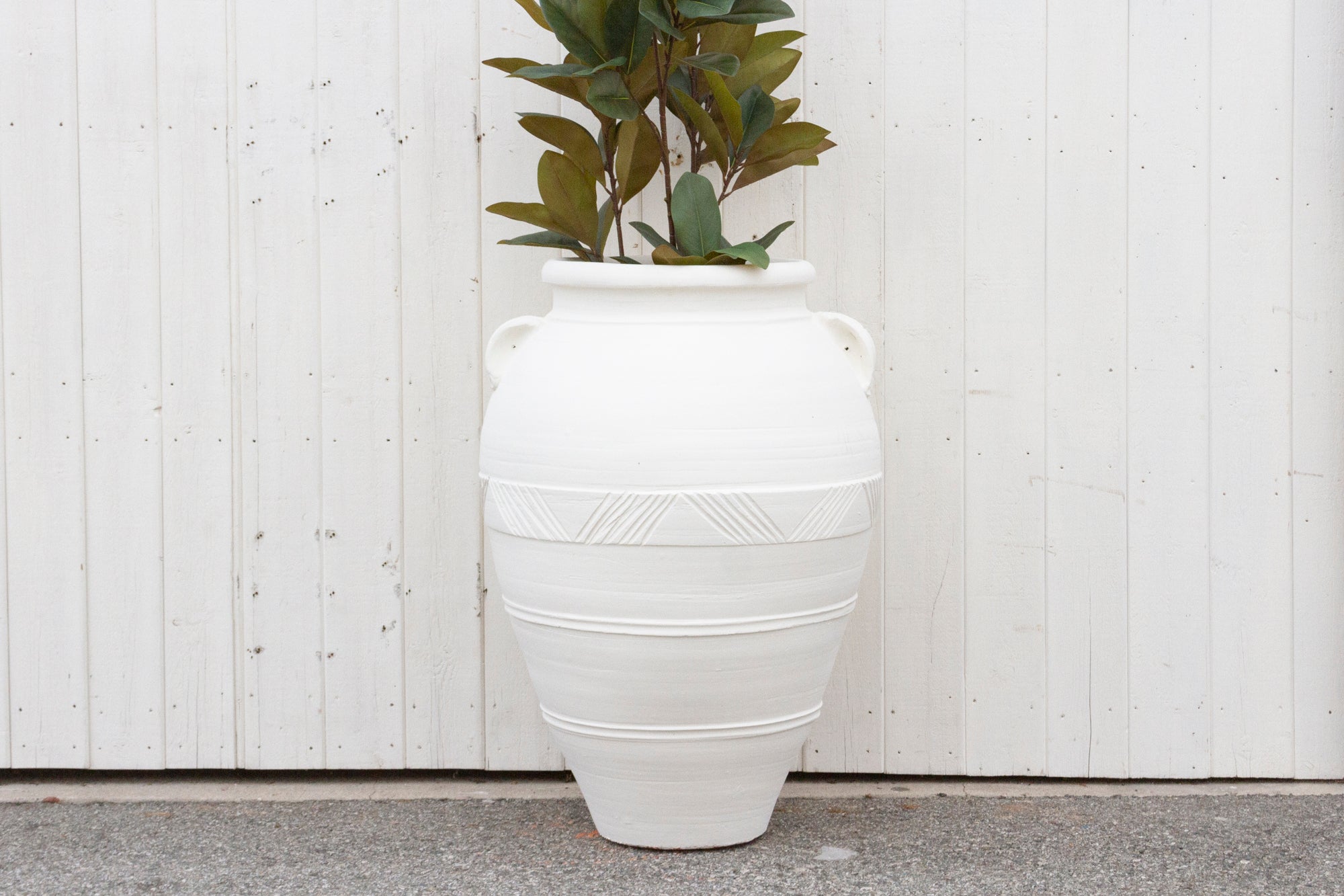 This large Greek planter is made from terracotta which gives the planters a rustic and natural feel. This outdoor terracotta pot is formed by hand which makes it one of a kind in nature and fired at high temperatures to make it hard and durable. These planters often feature traditional urns shapes with ribbed body or engraving in geometric patterns. This large clay planter has a rough, textured surface and feature a white painted unglazed finish that allows it's natural charm to show. This lovely European style planter is a unique and timeless piece that can give your home or garden an elegant, Mediterranean feel.