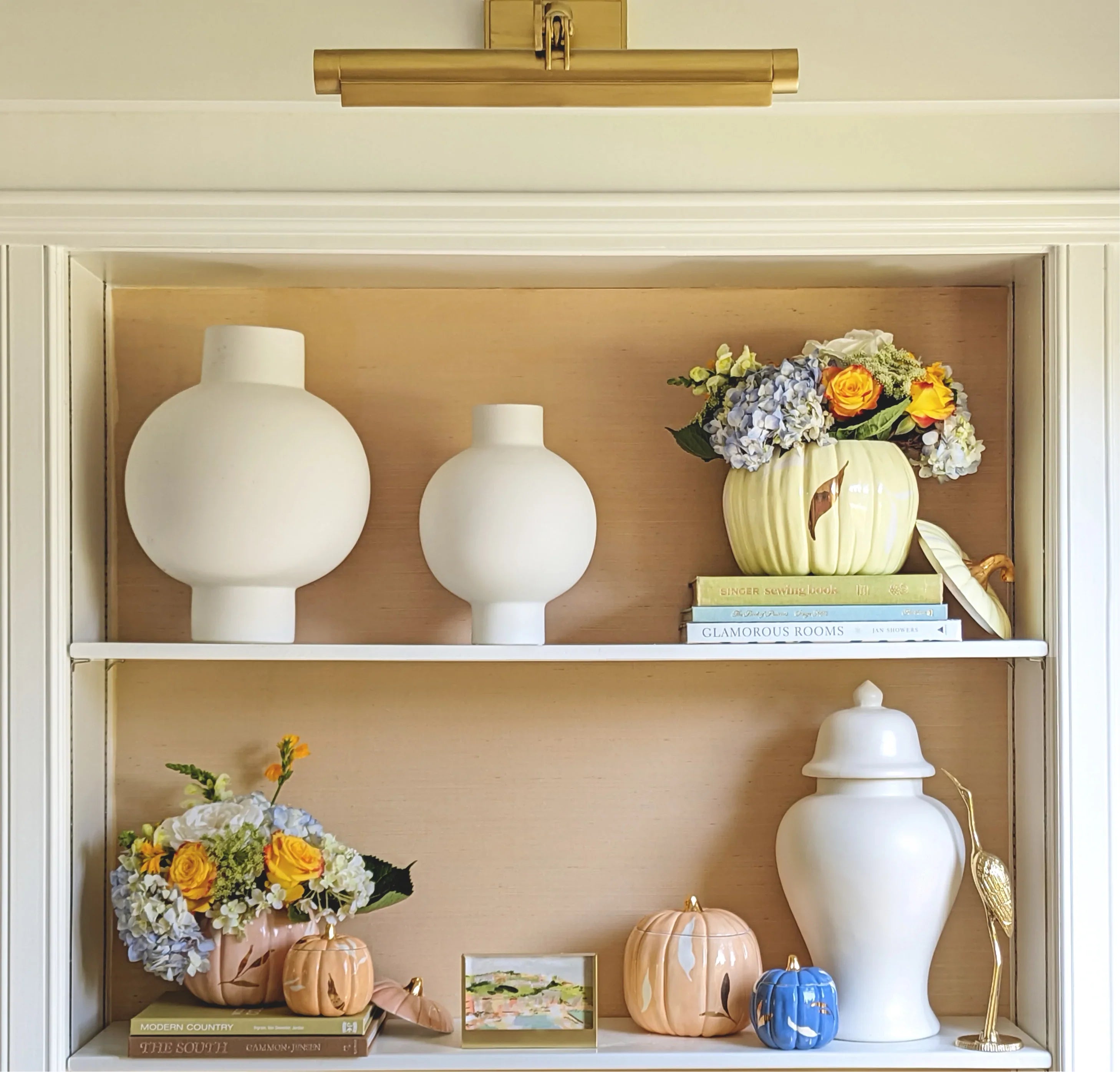 The falling leaves of autumn are layered onto these charming pumpkin -shaped jars during both the glazing and gold application process, and the result is an exquisite and unique take on a functional and festive piece. These jars can be used as a vase to showcase harvest blooms, hold yummy treats, or simply add a unique and colorful seasonal touch around the home.