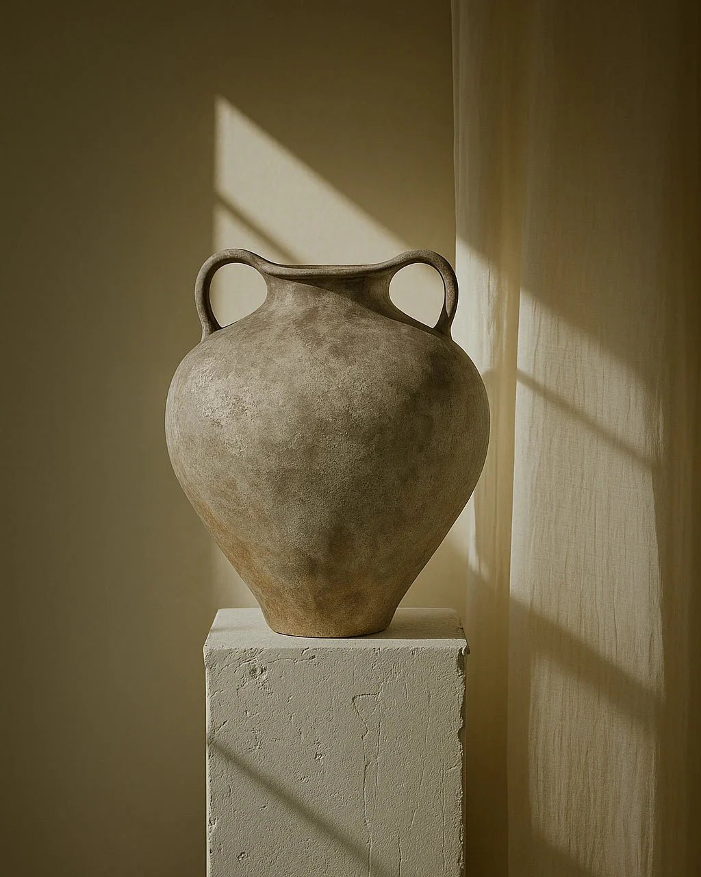 The Lucero Vase combines rustic charm with contemporary elegance through its distinctive textured surface reminiscent of weathered stone. This statement piece features soft white shades that create natural light and shadow variations, mimicking the authentic look of aged concrete for timeless sophistication.