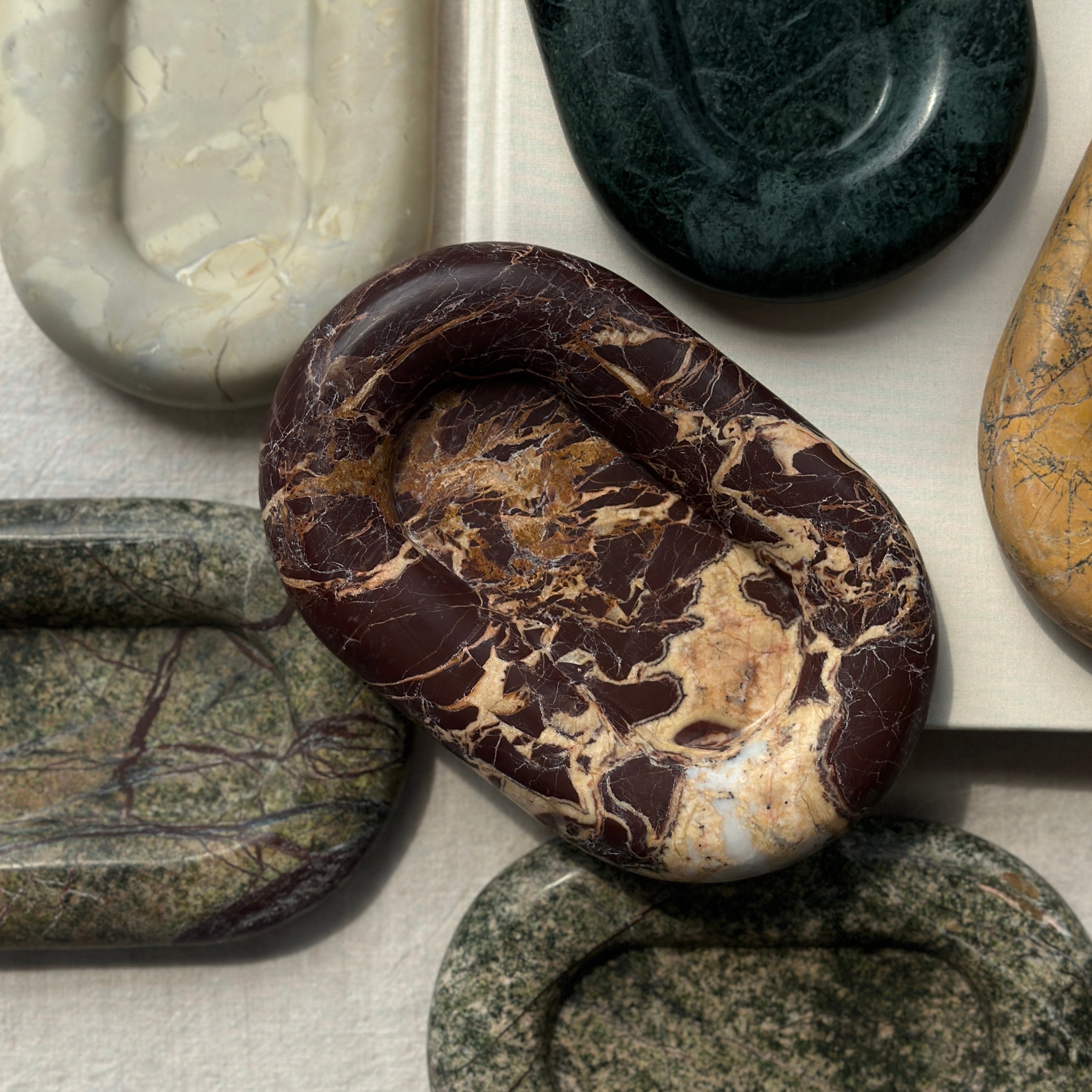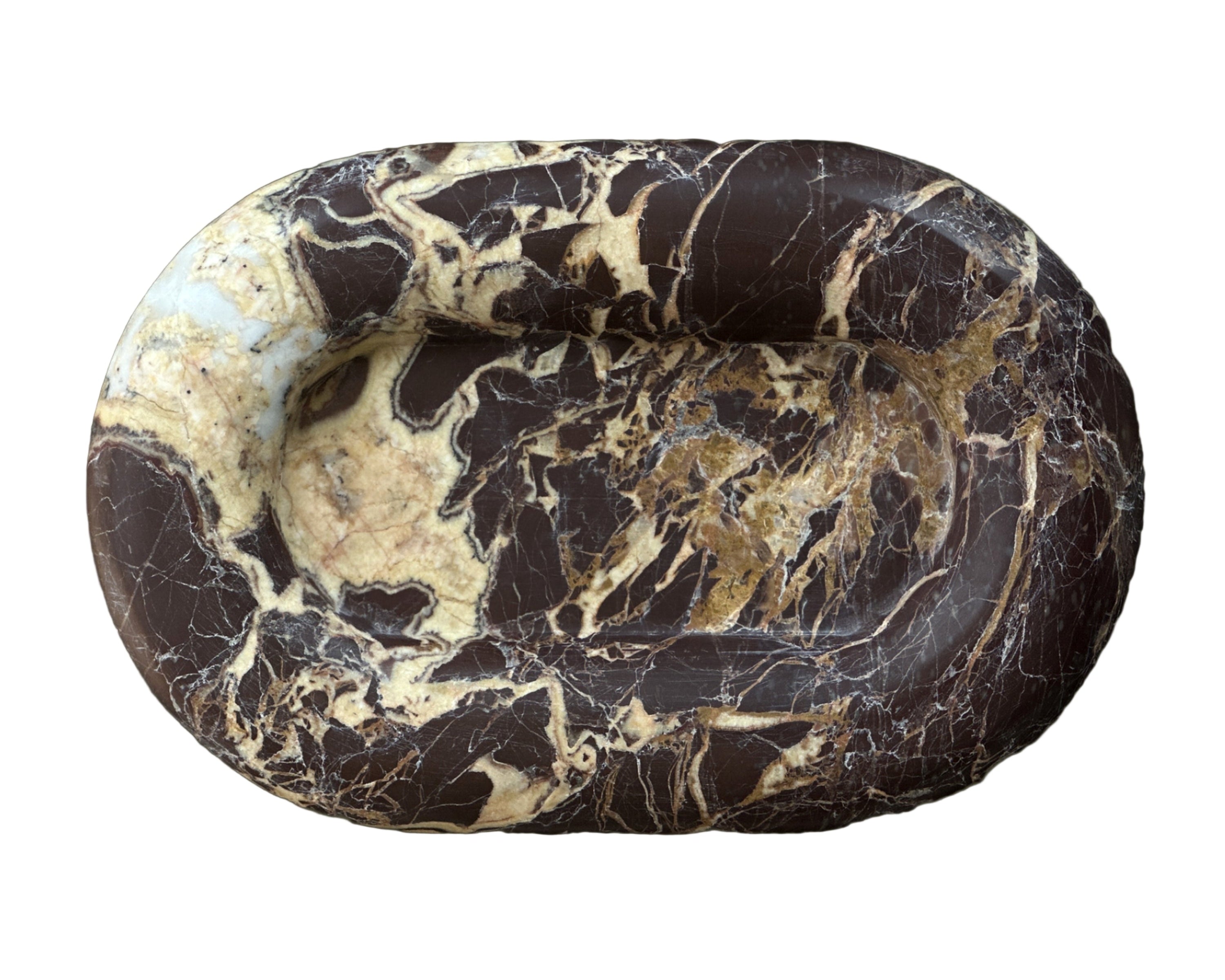 Carved from a single block of stone, the six-inch form is compact yet substantial, sized for rings on a nightstand, salt on the table, or as a sculptural accent in any room. Its thick, rounded edge gives it a modern softness, balancing weight with approachability.