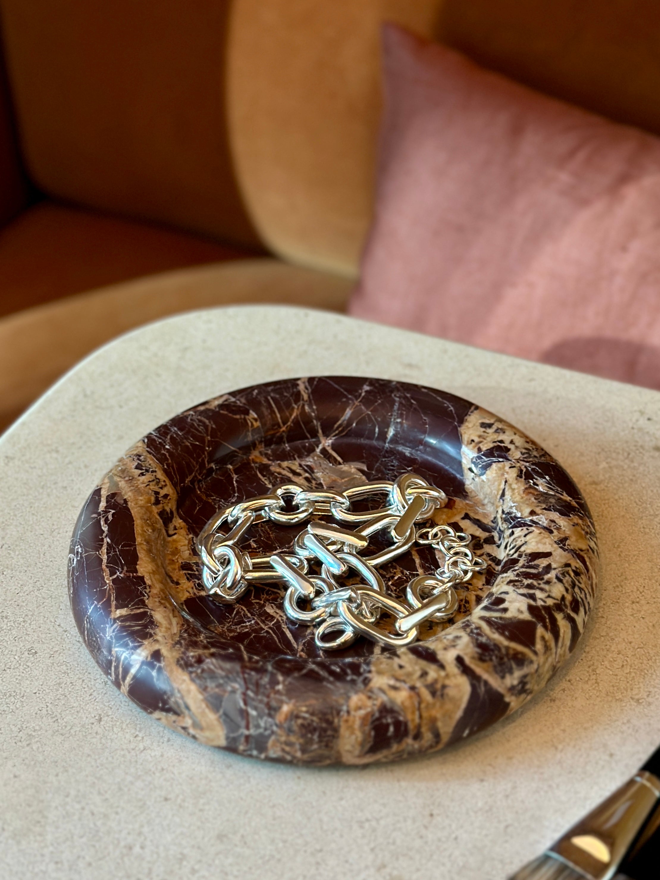 Carved from a single block of stone, its eight-inch form is substantial in weight yet softened by rounded edges. The recessed center is scaled for holding keys and glasses in the entry, jewelry on a dresser, or simply standing alone as a statement of form.