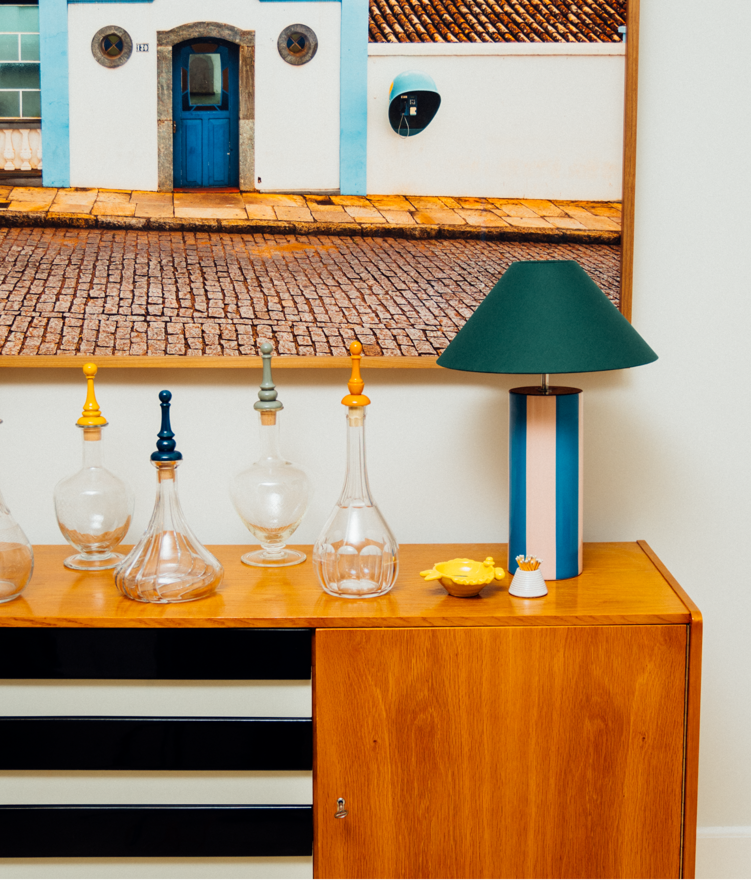 Elevate your space with the Cimelio Blu x Mattina Moderna collaboration Ombrellina lamp, a limited-edition piece that marries artisan craftsmanship with timeless beauty. Crafted in Portugal, this lamp features hand-painted stripes and luxurious fabrics, making it a stunning focal point for any room. Please note that each piece is handmade and variations in shape and color may occur.