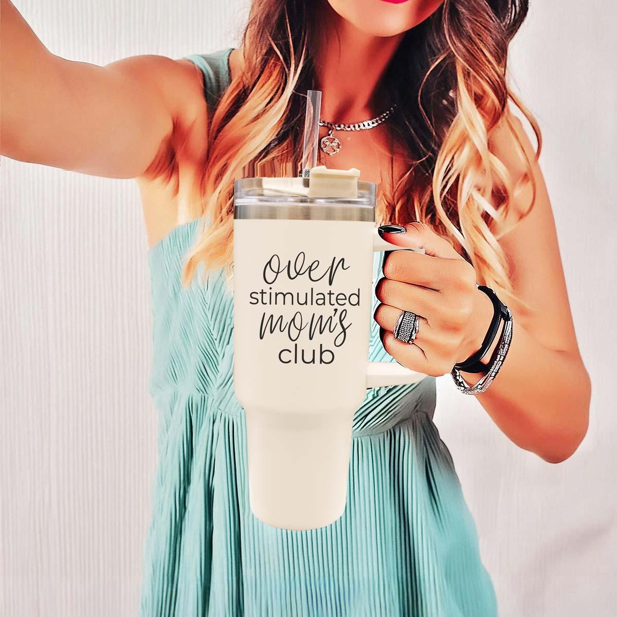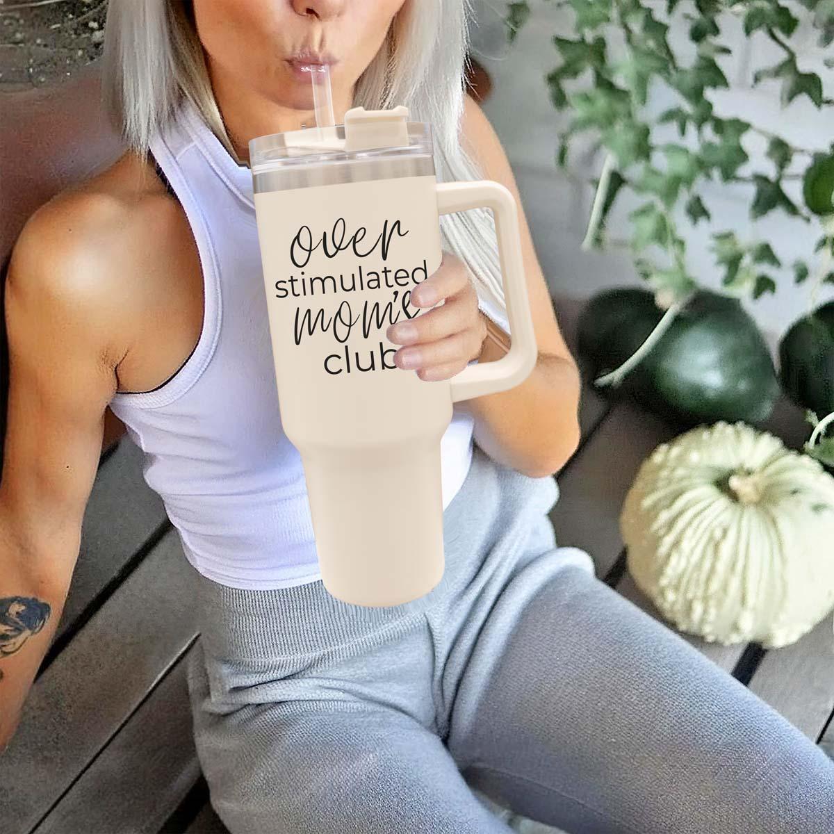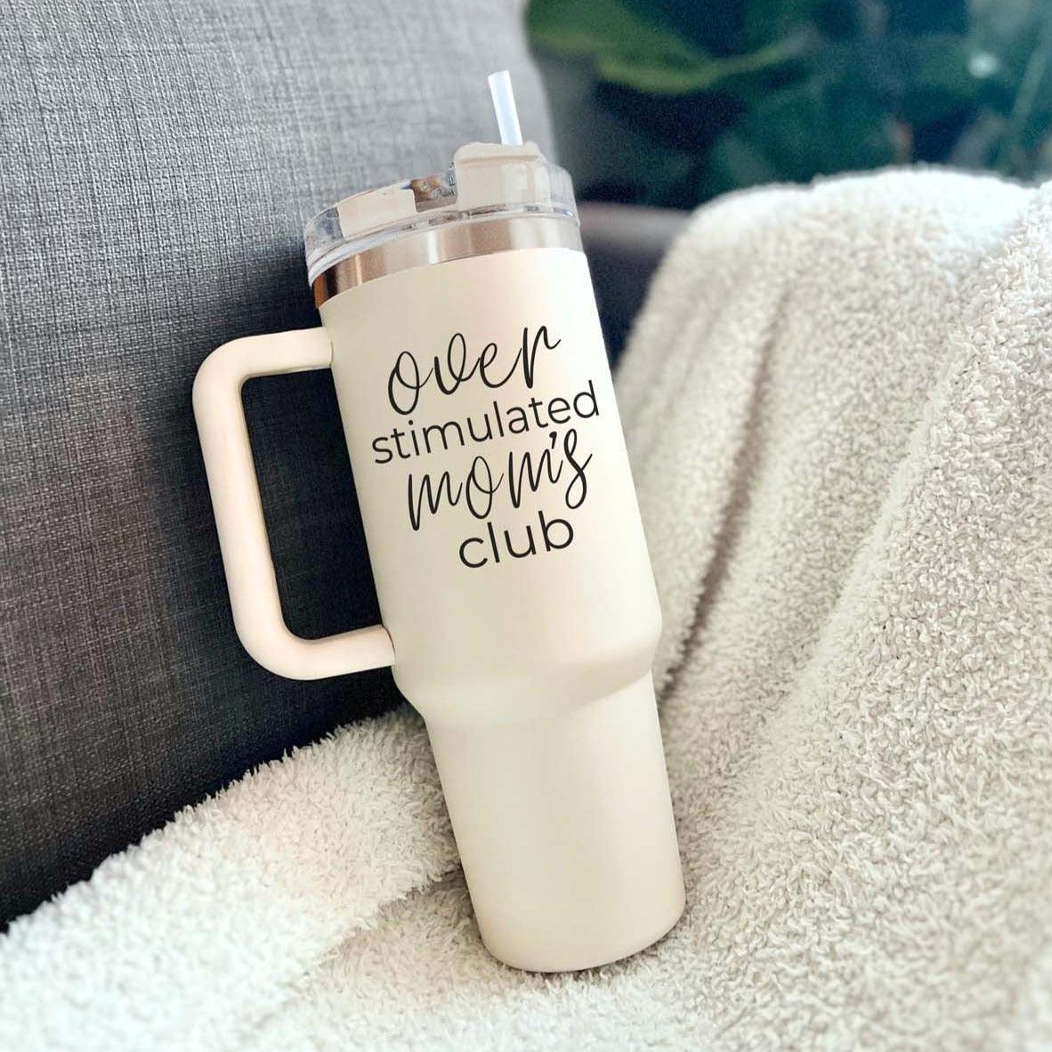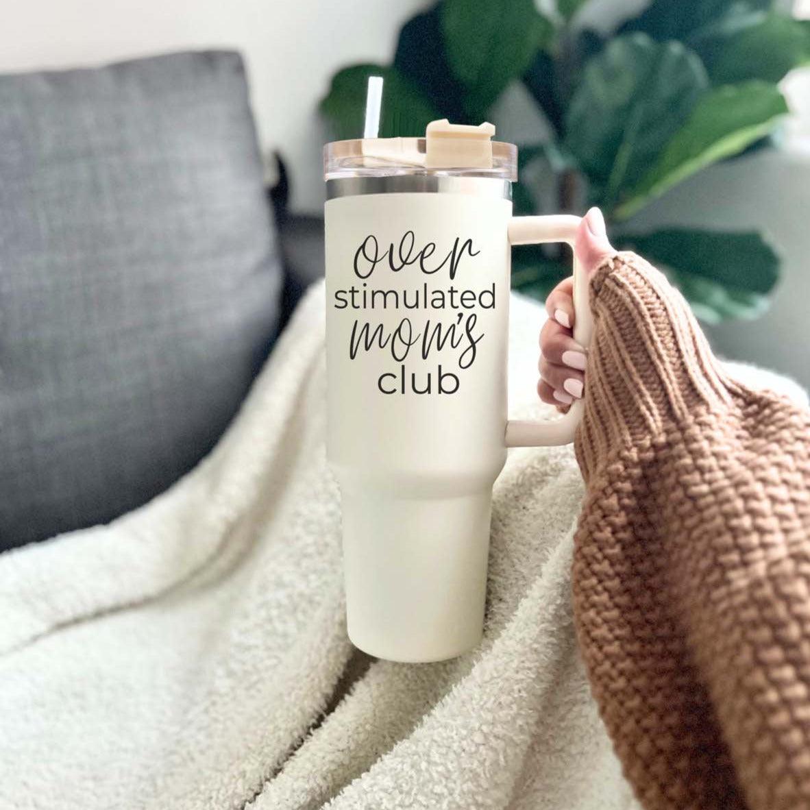 Over Stimulated Moms Club Insulated Mug with handle, lid and straw
