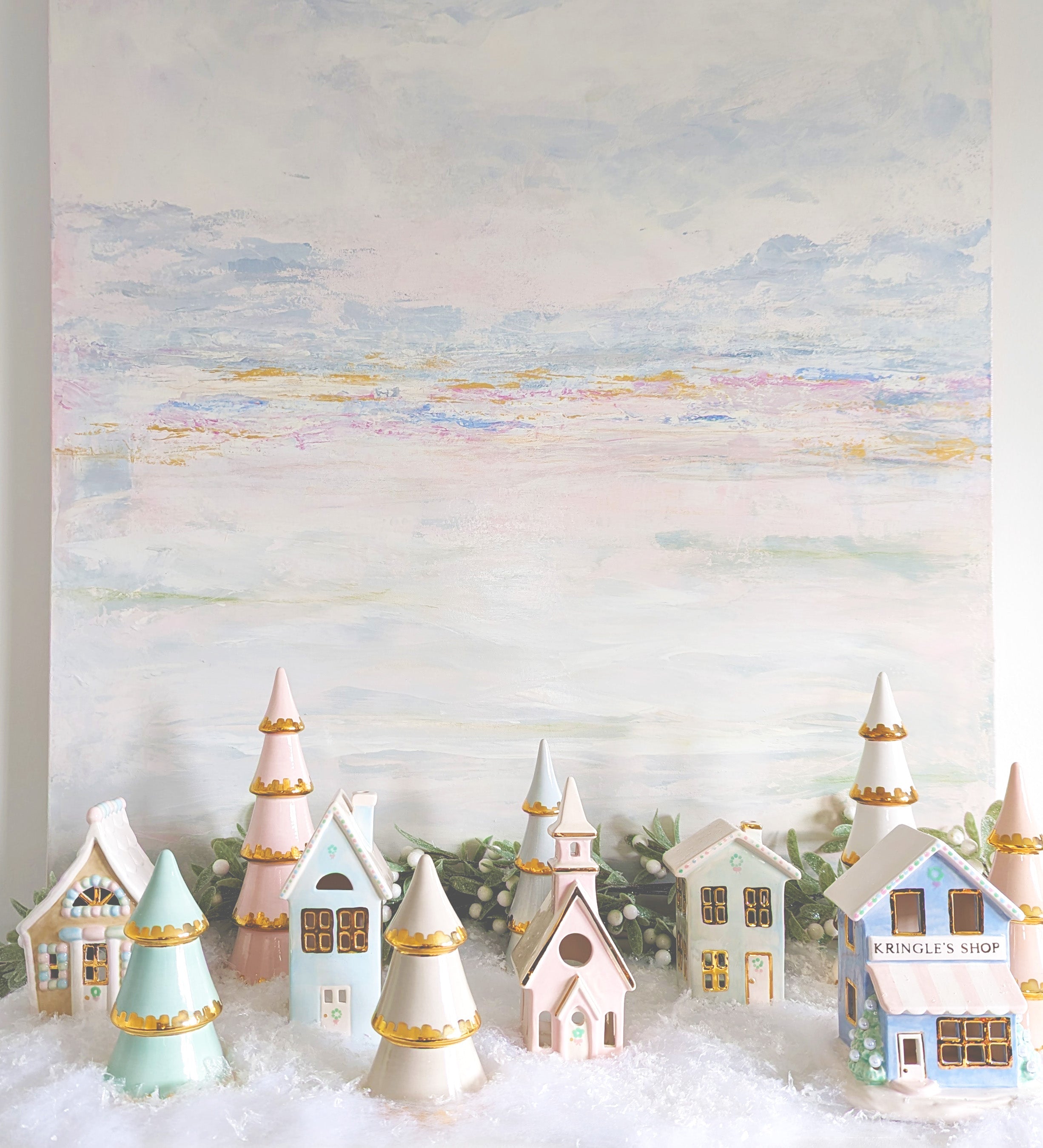 This beautiful hand-painted village is sure to become a treasured holiday heirloom. The three piece set includes two cottages and a chapel adorned with festive lights and wreaths. Each piece holds a tea light or fairy lights inside which allows warm twinkly light to shine out through the windows to create a dreamy winter wonderland.