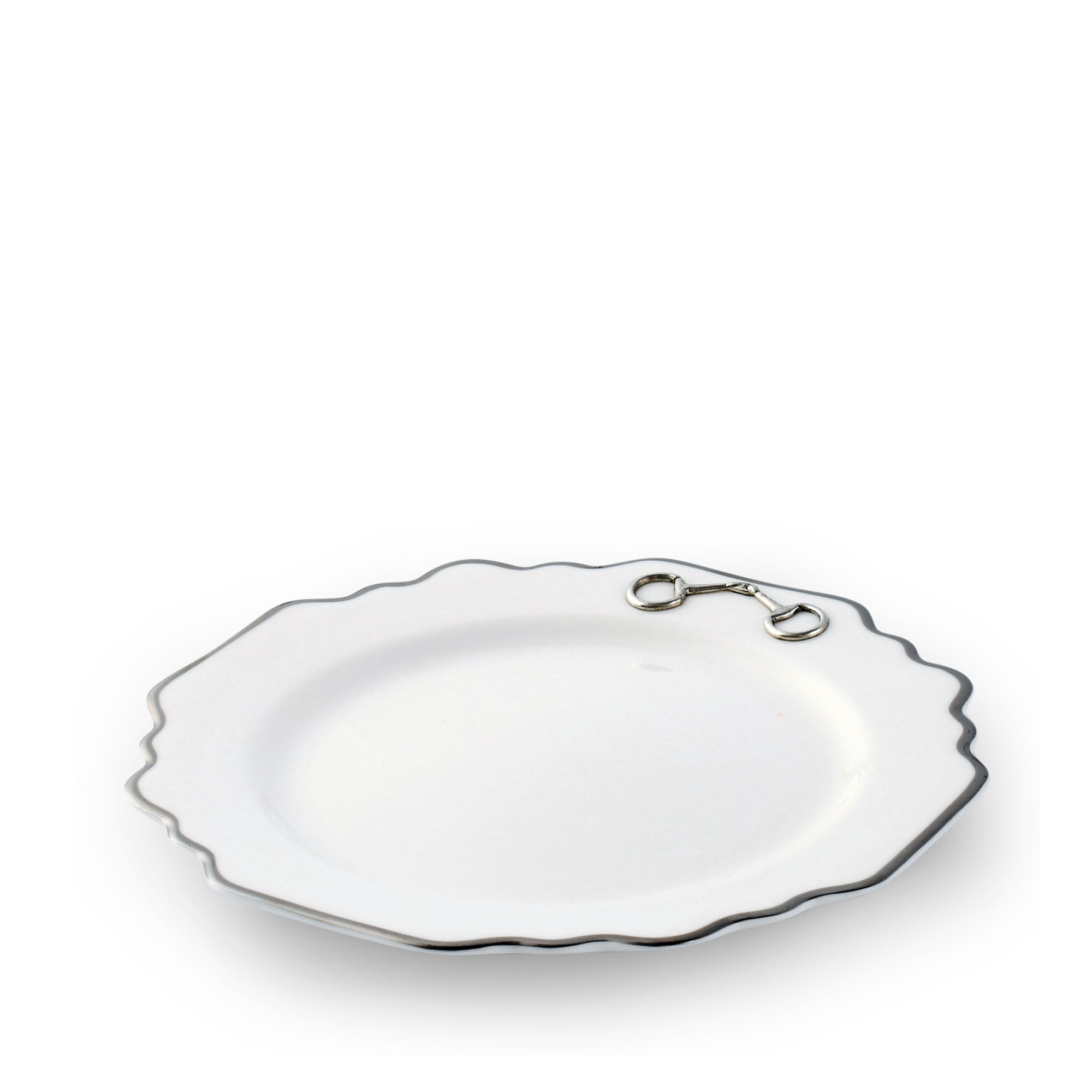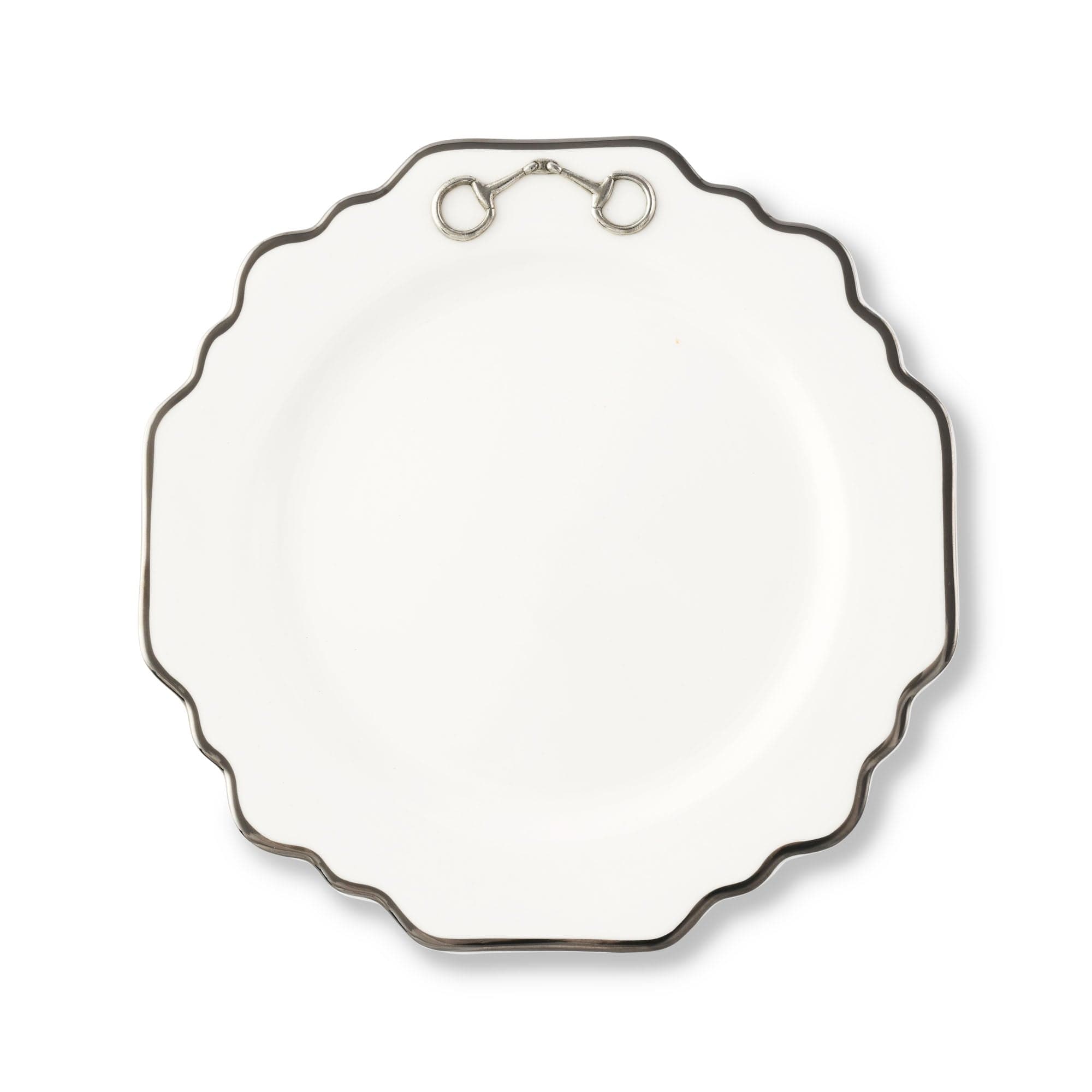 Experience luxury dining with this stylish 8.5" diameter Salad plate from our Equestrian Collection. Immaculately crafted from Bone China and Pewter, this plate features a unique scallop design rimmed in platinum, ideal for any elegant gathering. The equine-inspired pewter bit enhances its charm, making it a perfect unique gift for horse enthusiasts. Its compact size is perfect for serving salads or desserts with a touch of sophistication.