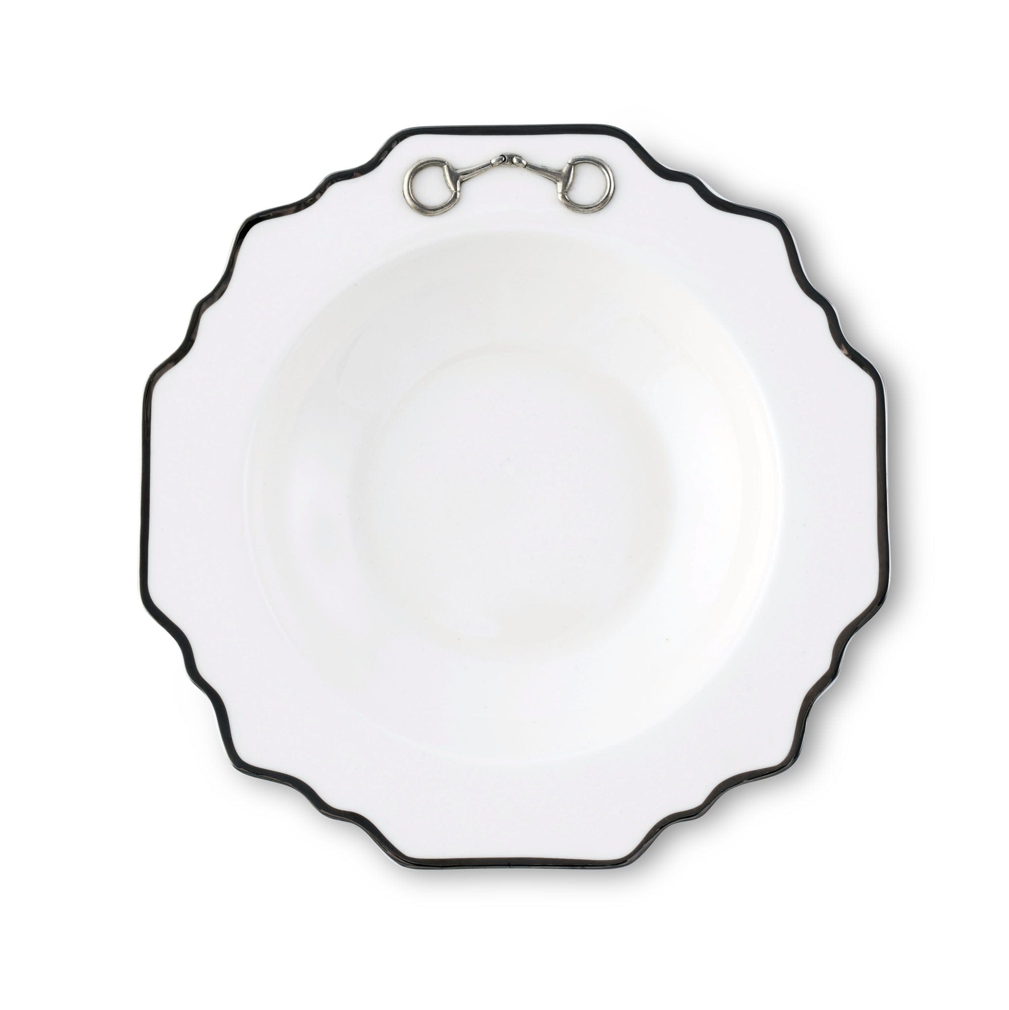 Create an enchanting tablescape with our 8.5-inch diameter Equestrian Themed Bone China Soup Plate crafted of high-end bone china and pewter. Its scalloped edges and platinum rim present a regal aesthetic, highlighted further by a pewter bit that adds a stylish Western element. This exquisitely designed soup plate can elevate your everyday dining experience or grand celebrations, making it an ideal gift for those who appreciate high-quality dinnerware in their collection.
