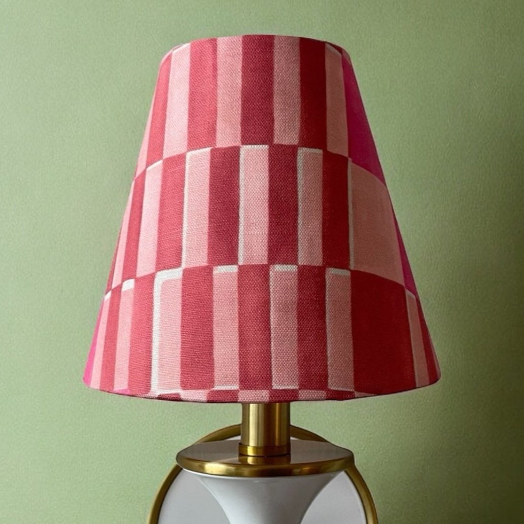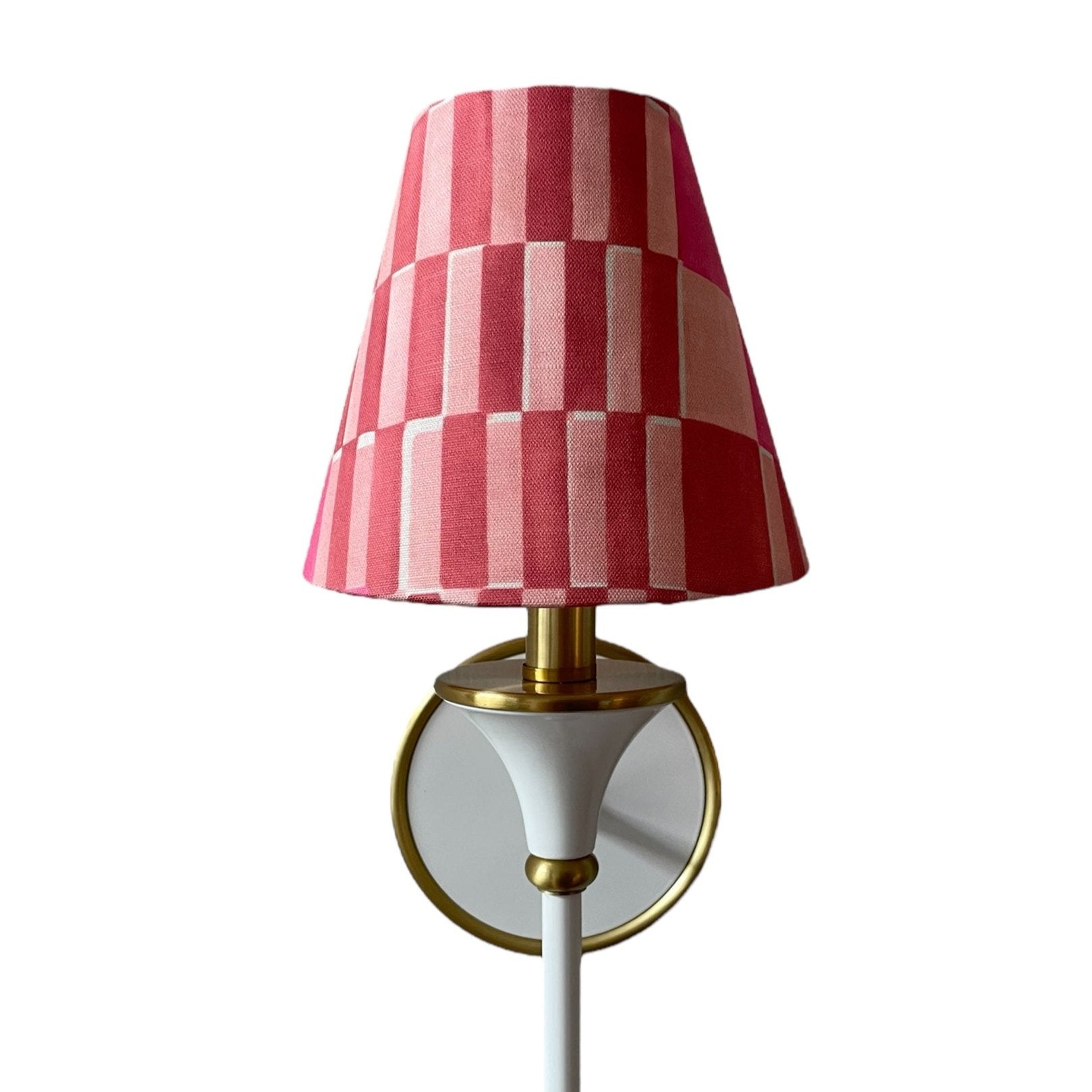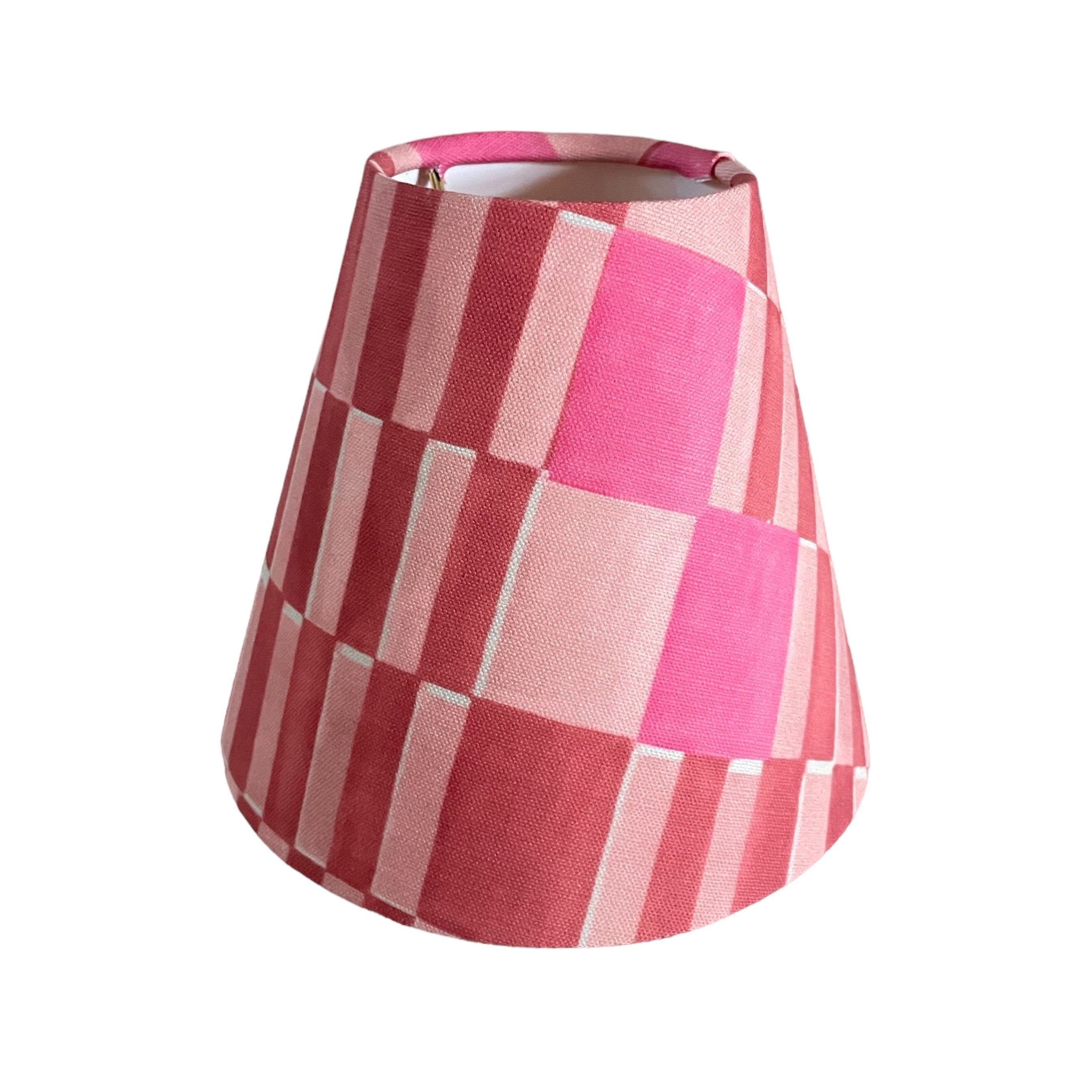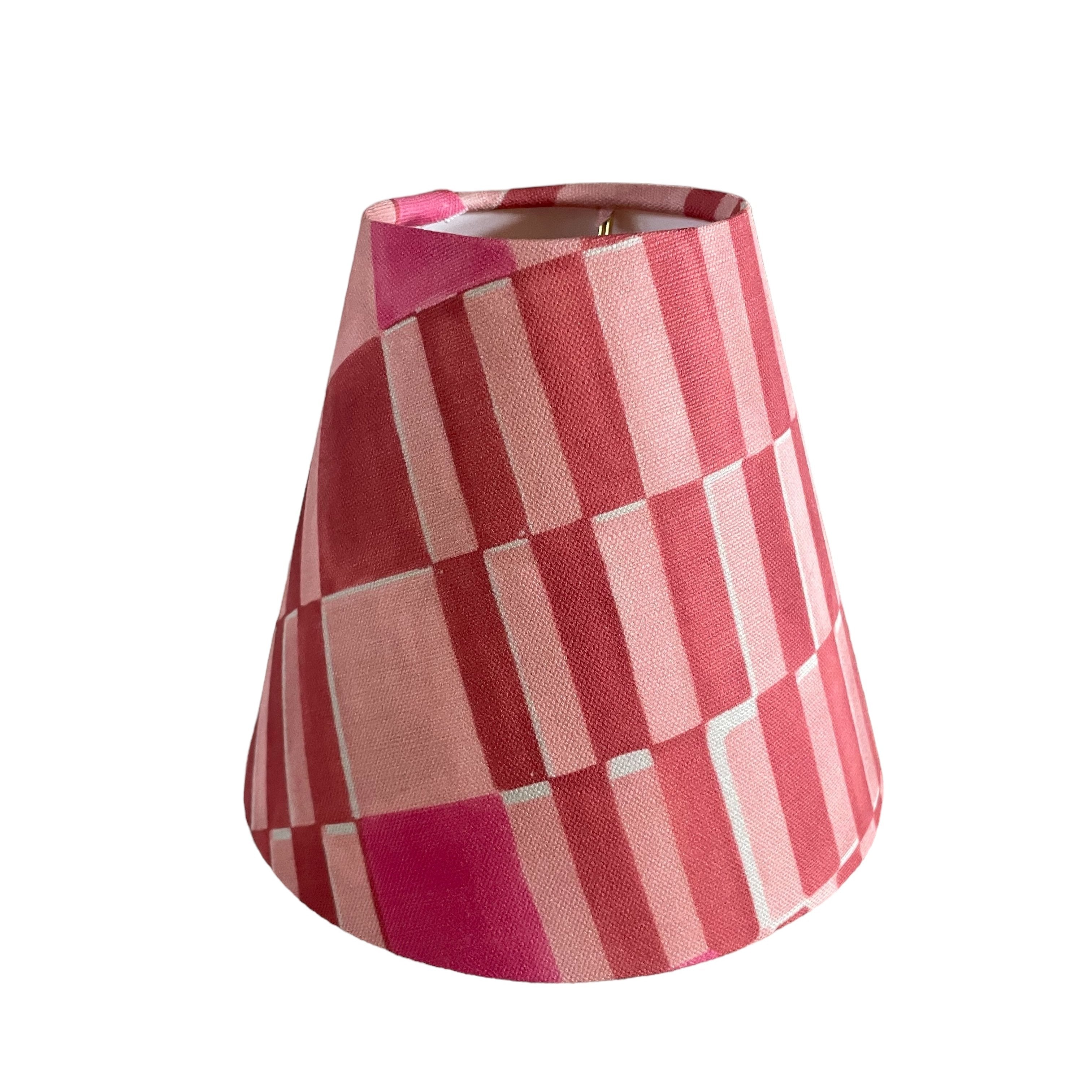Transform your home decor with a bold and modern pink clip shade, perfect for sconce shades and chandeliers. This small lampshade features big style in a playful, block printed design by Virginia Kraft. This mini empire lampshade is an easy way to elevate any space.