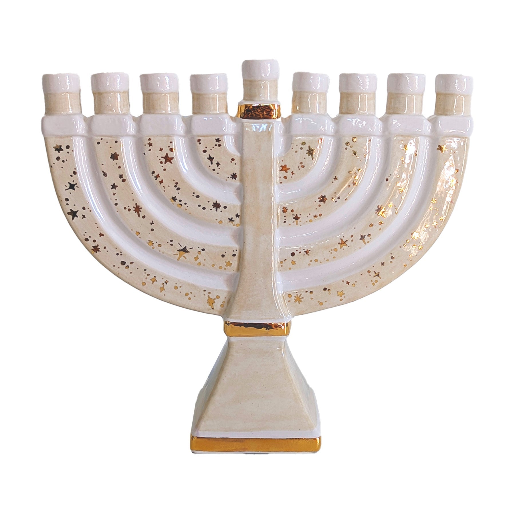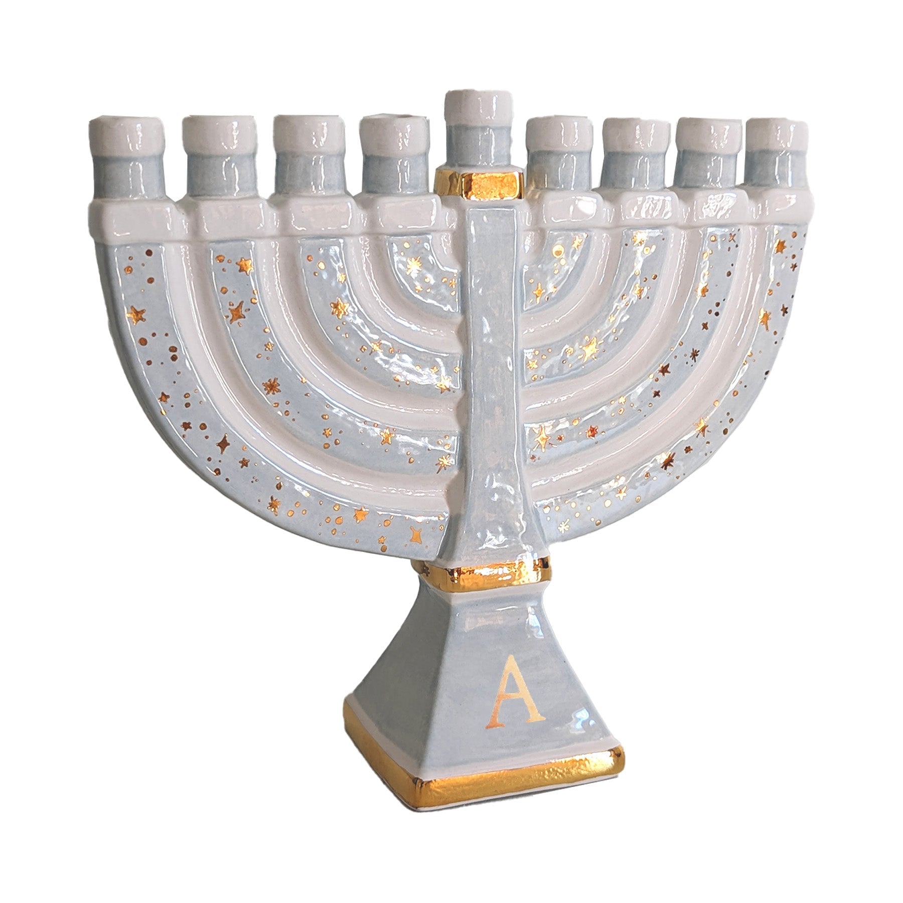 This Menorah perfectly combines traditional and fresh elements for a stunning, shimmering piece that will surely become a treasured heirloom. This hand-crafted menorah is adorned with 22K gold stars applied with love by our talented artisans. Each piece is a unique and one-of-a-kind work of art.