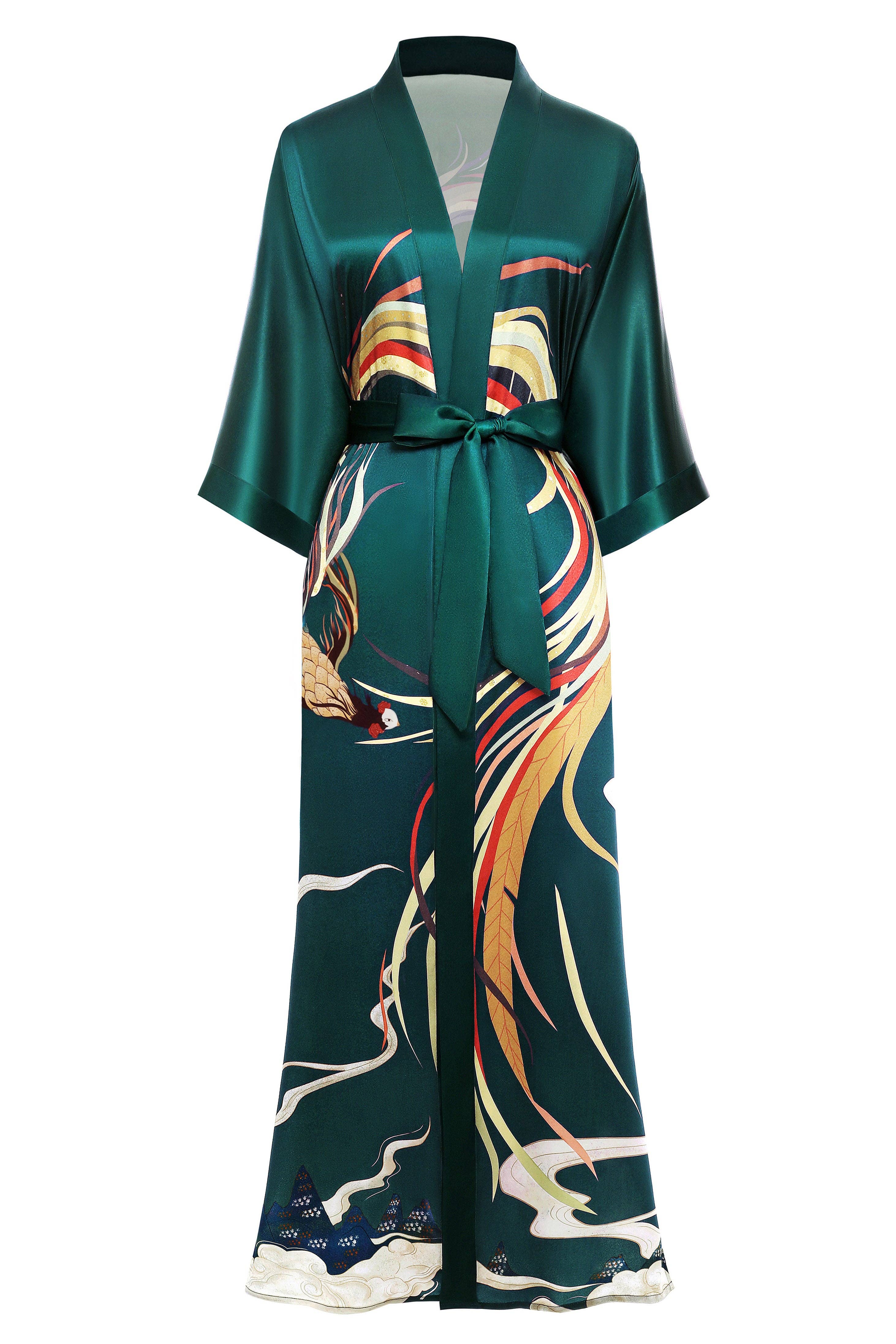 Wrap yourself in this luxurious silk-touch satin kimono, adorned with a vibrant phoenix and landscape motif. Crafted with French seams for a smooth, elevated finish, it drapes beautifully while offering breathable comfort — perfect for daily wear or special moments.