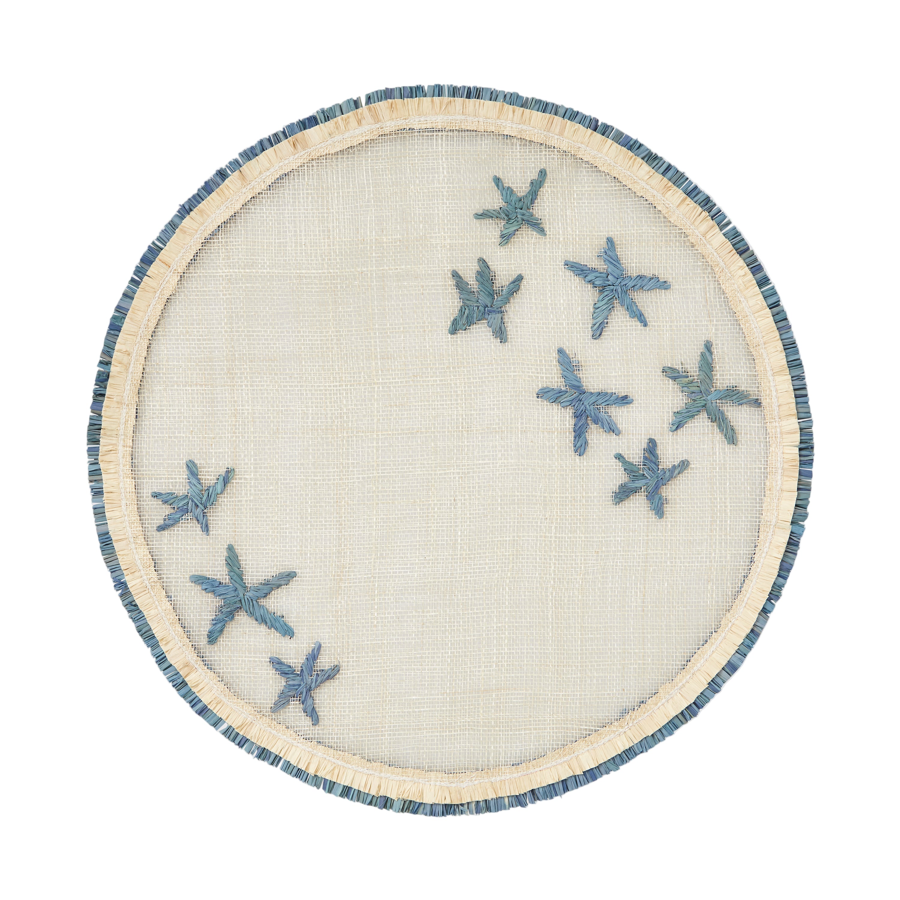 • Handcrafted blue and natural straw design — could be stars or starfish, depending on your mood!