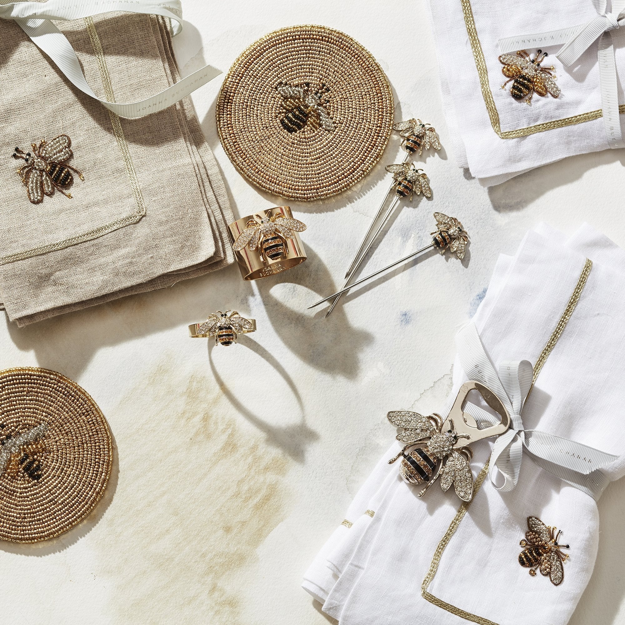 Classic white linen dinner napkins featuring charming embroidered bee motifs that add a touch of whimsy and elegance