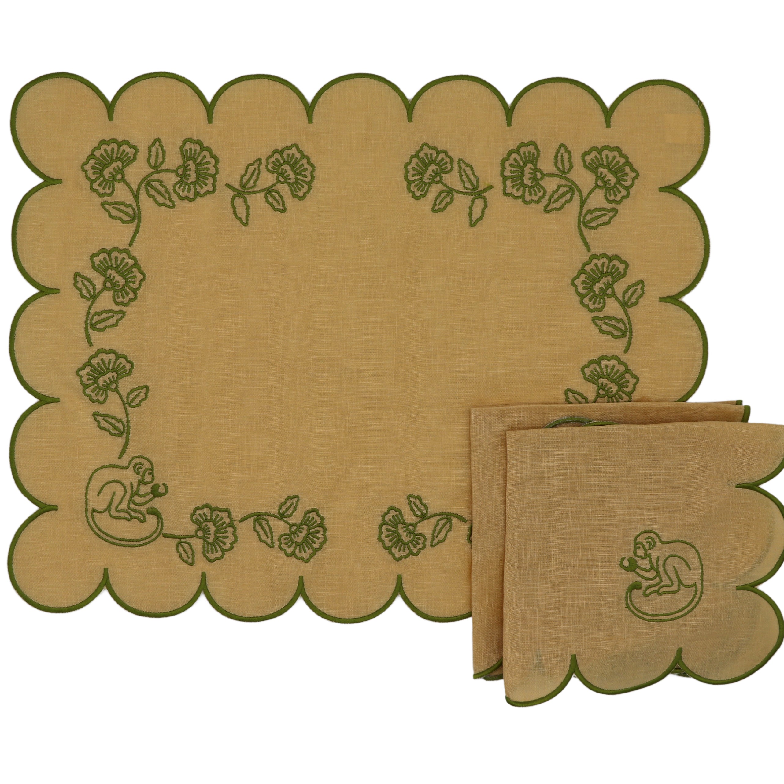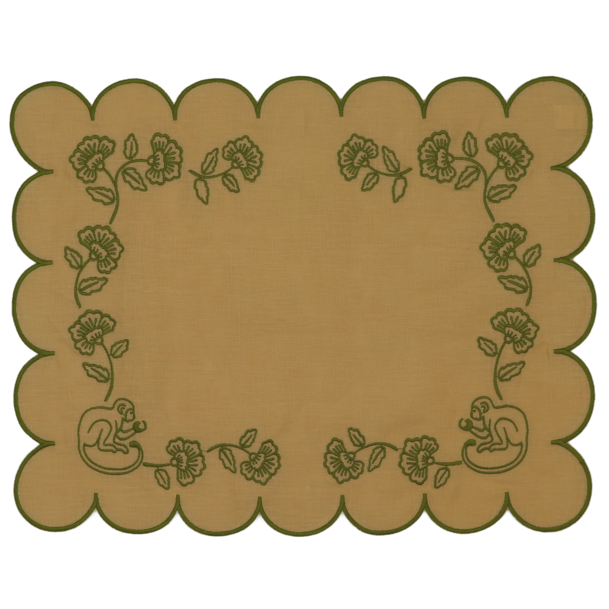 Step into the lush embrace of the Indian tropics with our Sunlit Moss Placemat from the Shimla Social Collection. Crafted from 100% yellow linen, adorned with a moss green embroidery of English florals, monkey motifs, and a scalloped trim. Pair it with our coordinating tableware from the Shimla Social collection