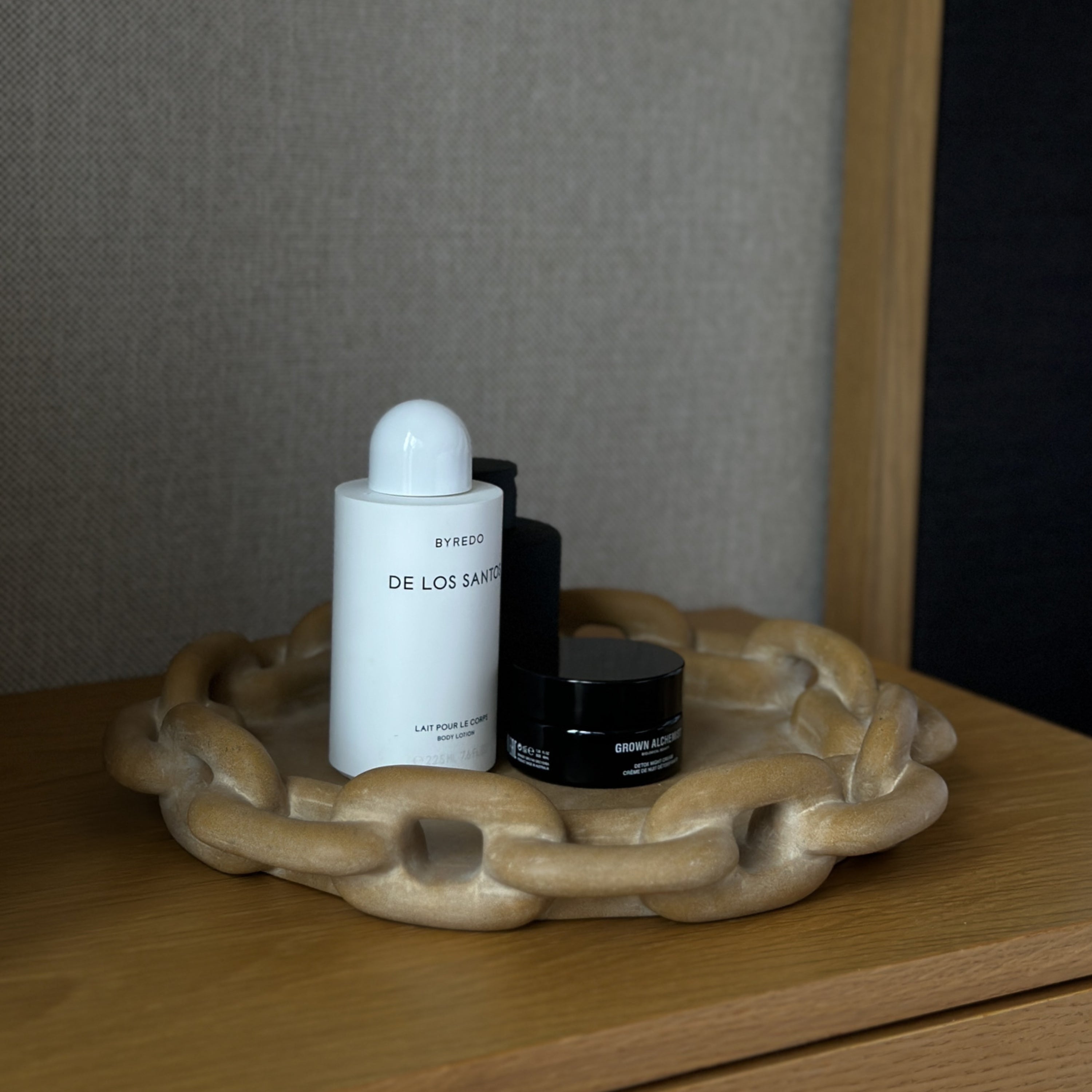 Intricate and architectural—the Chain Tray is defined by its sculpted ring of interlocking links.