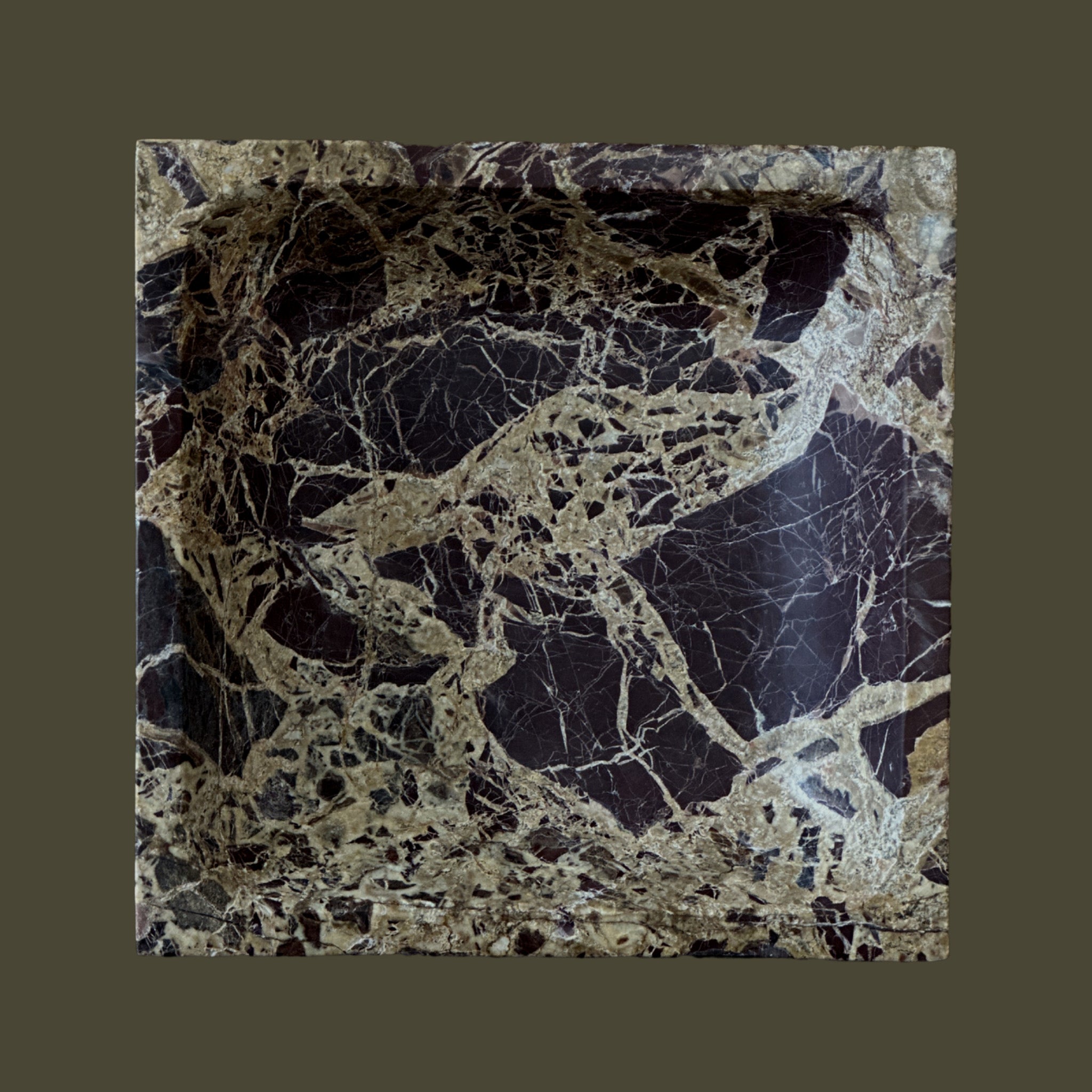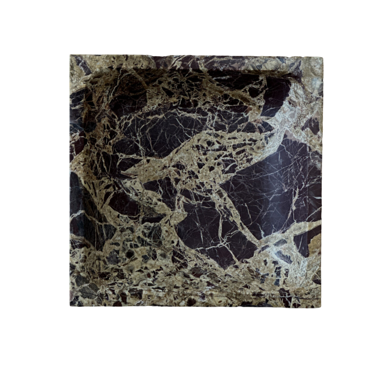 Carved from a single block, its softened interior scoop contrasts with the sharp outline of its square frame. At 8″ across, it’s scaled for staging fruit, resting jewelry, or standing alone as a sculptural accent. The stepped base gives it quiet elevation, making it feel both substantial and airy at once.