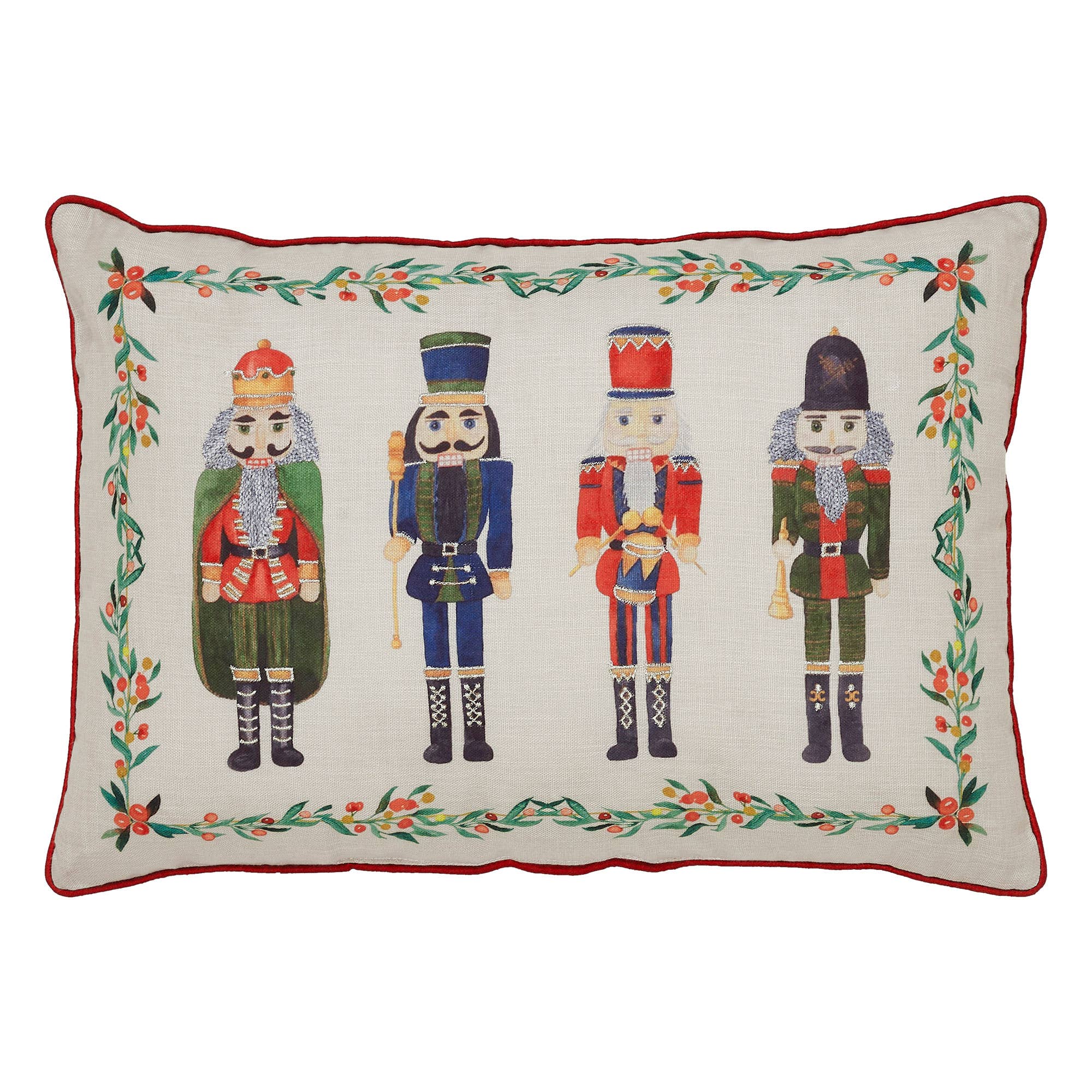 Add a festive touch to your holiday home with the Traditional Nutcracker Pillow. This charming accent pillow features four classic nutcrackers standing proudly in colorful green, red, and blue suits — each bringing a dose of nostalgic Christmas cheer. Set against a warm dark crème background, the detailed print is framed by a border of evergreen branches and red berries for a beautifully finished look. Red piping around the edge adds a crisp pop of contrast and enhances its timeless, traditional appeal.