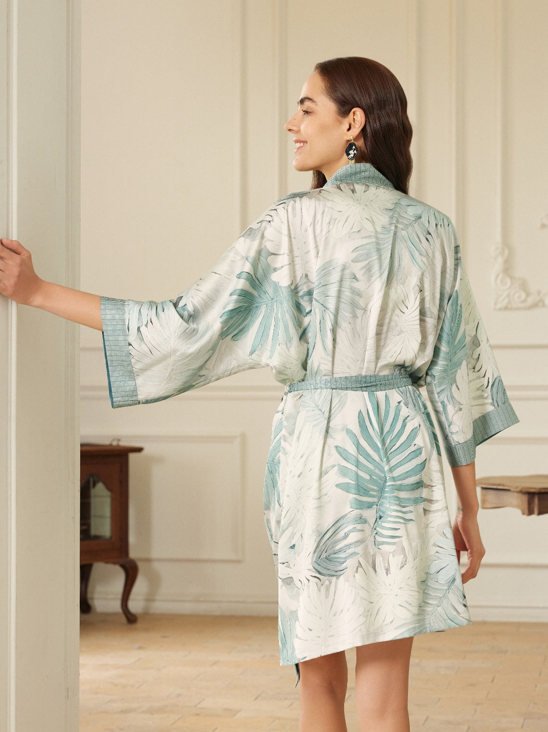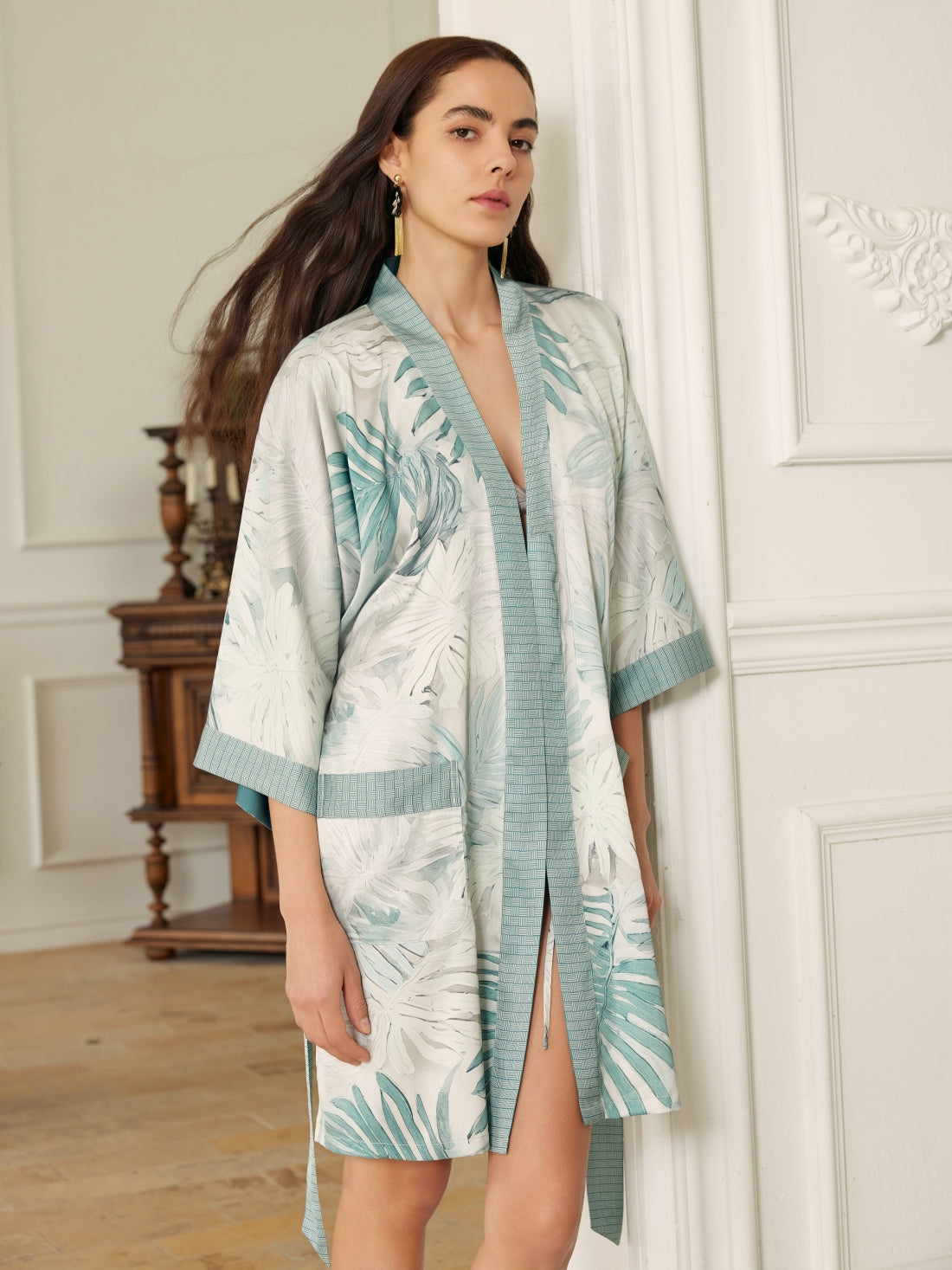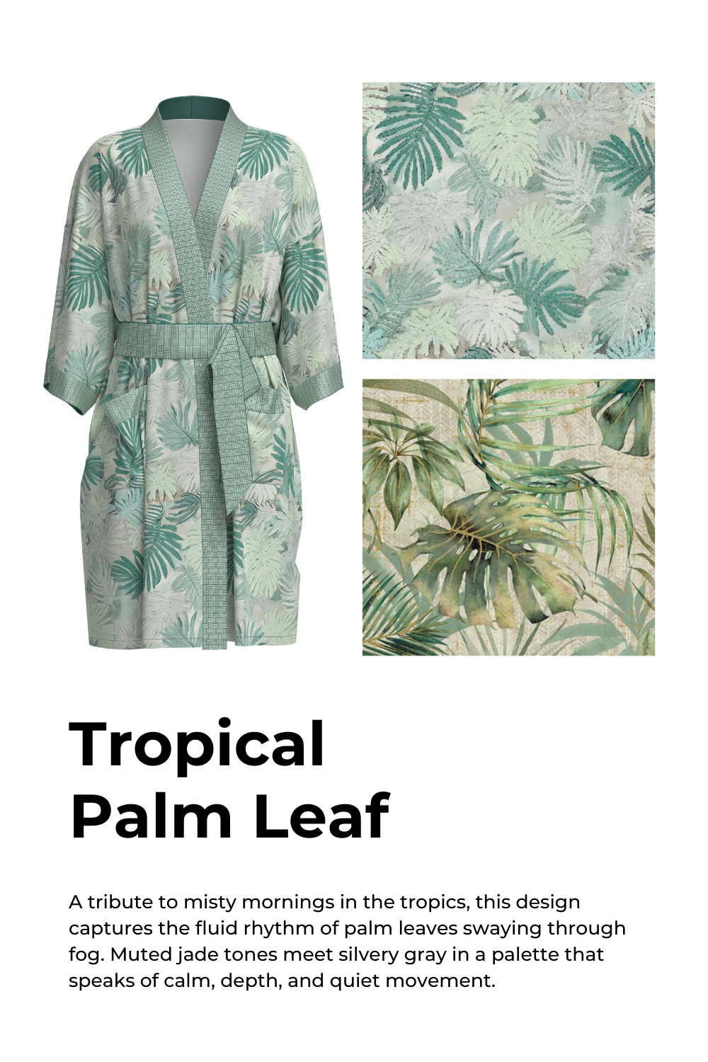 • Unique Design: Featuring a soft, semi-translucent effect inspired by tropical palm leaves shrouded in mist, this robe evokes the soothing atmosphere of a tropical retreat.