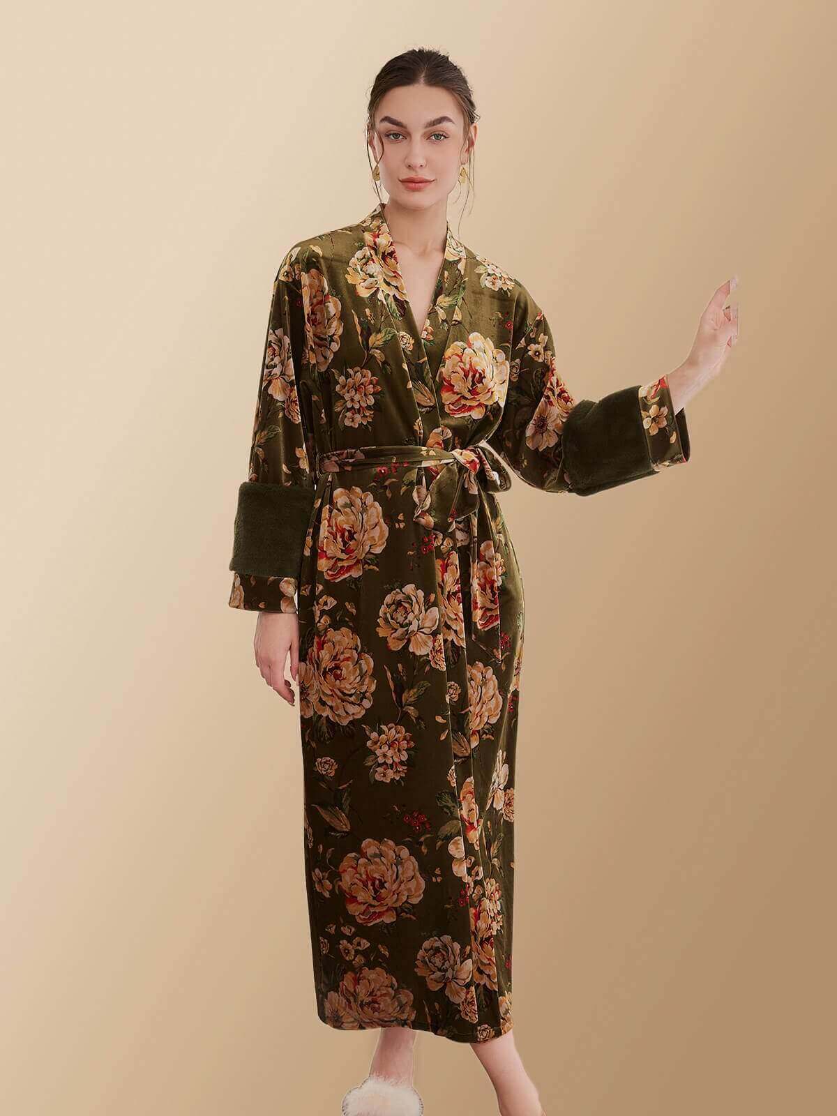 •Luxurious Material: Made from high-quality velvet, this robe is incredibly soft and warm, providing a cozy feel without compromising on style. The lush olive green color paired with the floral print adds a unique charm to your wardrobe.