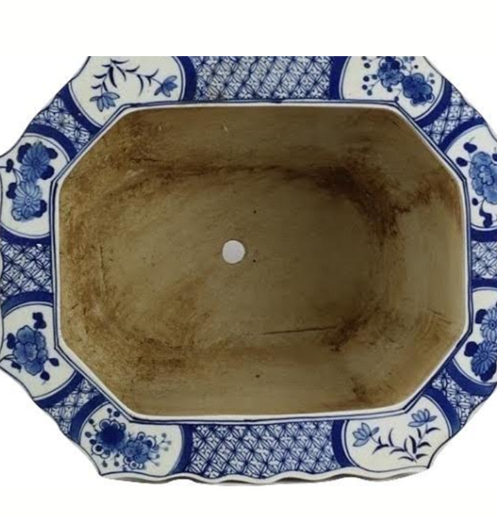 This piece is so majestic and is perfect for orchids, boxwood or a large floral arrangement. Truly beautiful and of heirloom quality. Features stunning hand painted scene on entire body as well as elegant pierced, scalloped detailing.