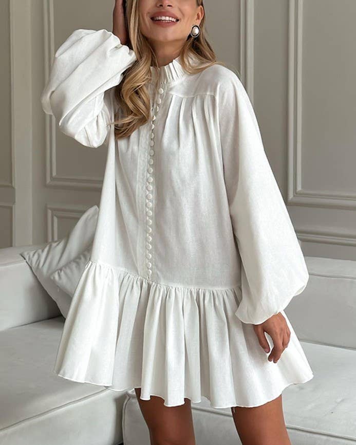 Timeless and feminine, this blue and white dress features a delicate vintage ink print with soft puff sleeves and a cinched waist that flatters every silhouette. Its flowing shape and elegant detailing make it perfect for brunches, garden parties, or daytime outings. Pair it with heels or flats for an effortlessly refined look.