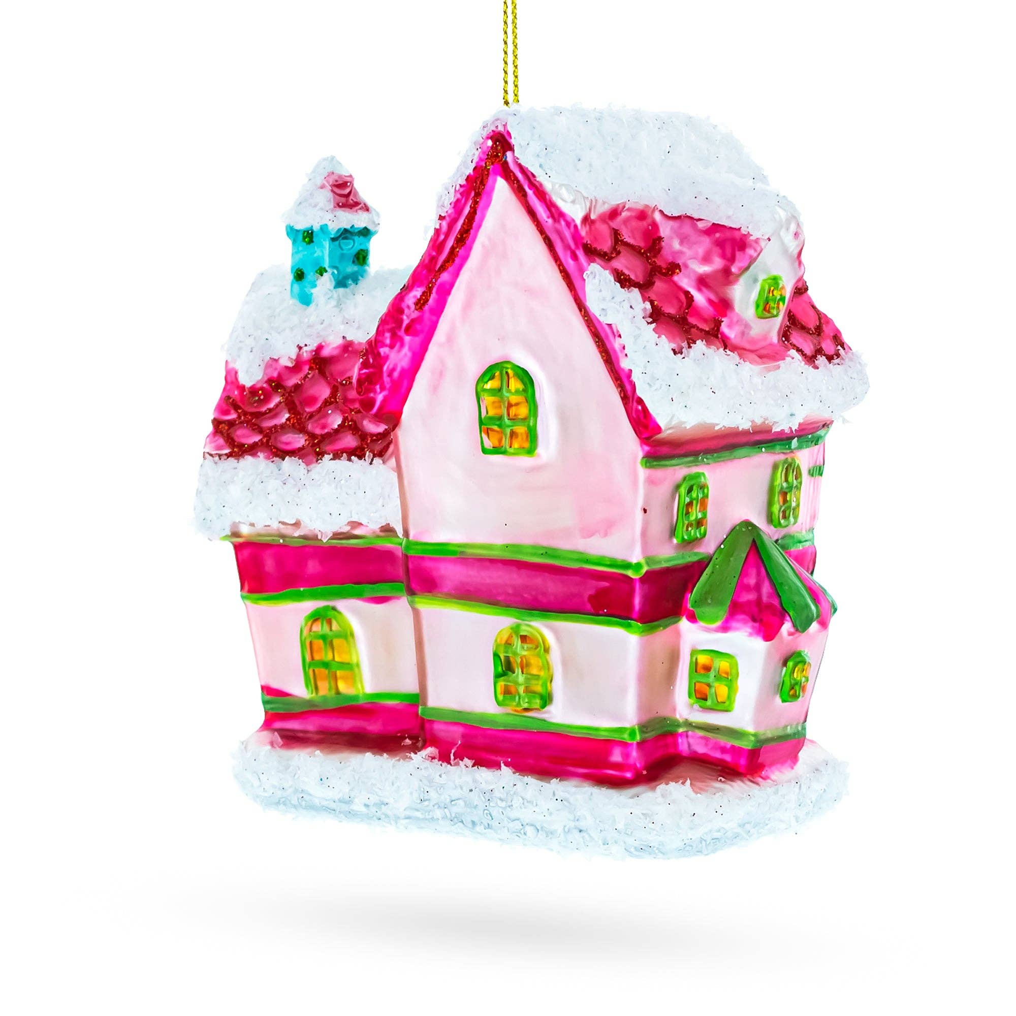 Bring storybook magic to your Christmas tree with this charming Toy Shop House Glass Ornament. Handcrafted using traditional blown-glass techniques, this piece features vibrant colors, glittery frosting-like snow, and playful details that evoke the wonder of a classic holiday village. Each ornament is hand-painted to highlight its delightful character — from the snowy roof to the glowing windowpanes and festive holiday tree out front.